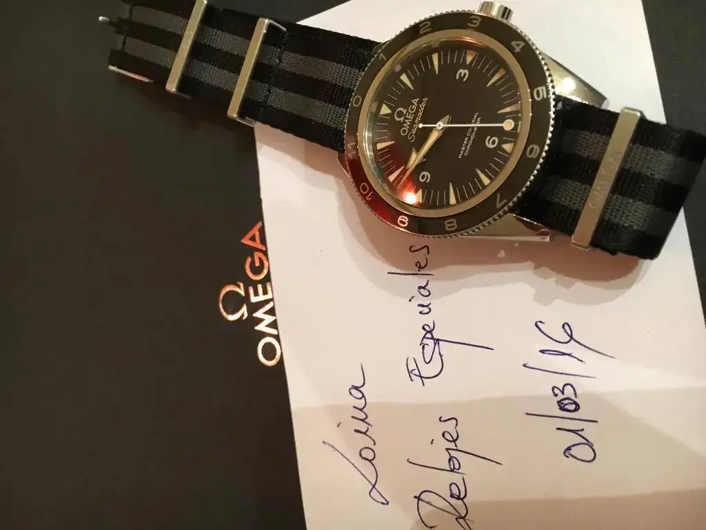 Correa Nato tipo Bond con las inscripciones Omega y 007, una maravilla de gran calidad. Se acompaña de brazalete de acero enteramente cepillado, sin zonas pulidas, que lo hacen más bonito que el del modelo de producción en serie. Brazalete con sistema de extensión denominado por Omega "rack-and-push" y que permite un inmediato ajuste del mismo.