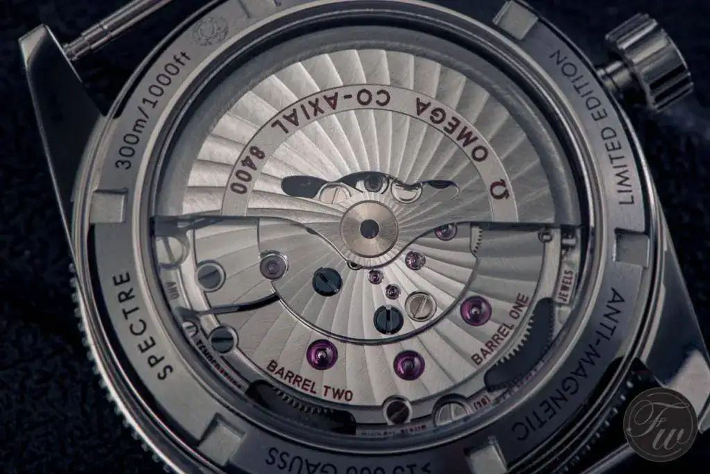 Calibre automático Omega 8400 Co-Axial con 2 barriletes montados en serie.