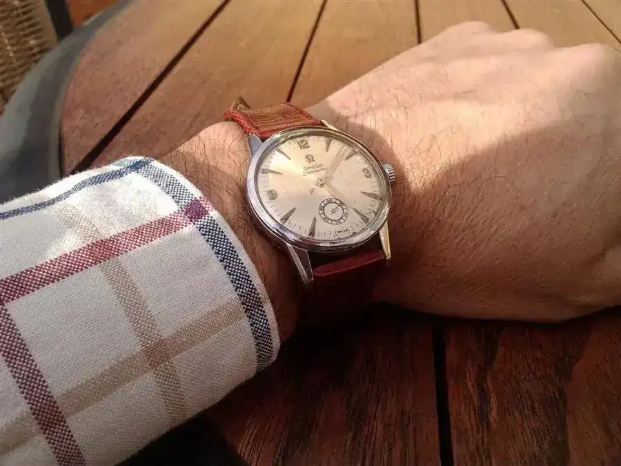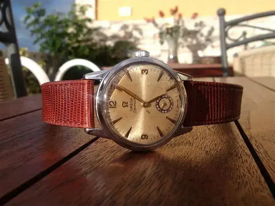 Caja en muy buen estado,plexy impecable con el símbolo omega en el centro...marcha buenísima para un reloj con unos cincuenta años.