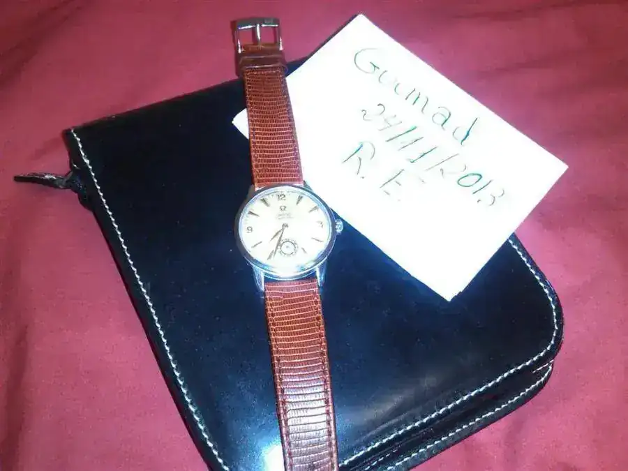 Corona a presión original marcada. Ancho de armis,18 mm. Se te manda con una correa no original de piel de lagarto,usada pero en buen estado, y que le queda muy bien.