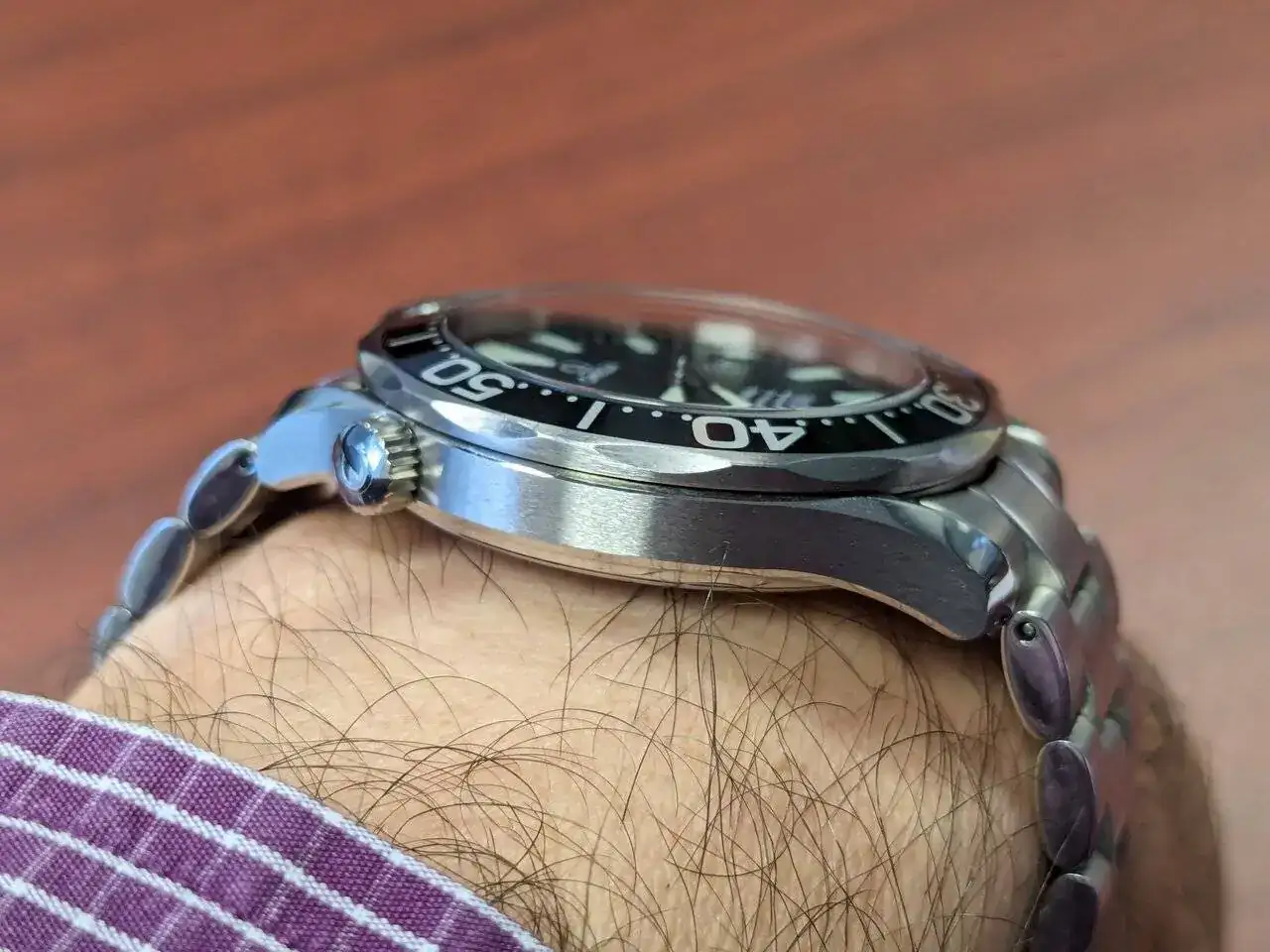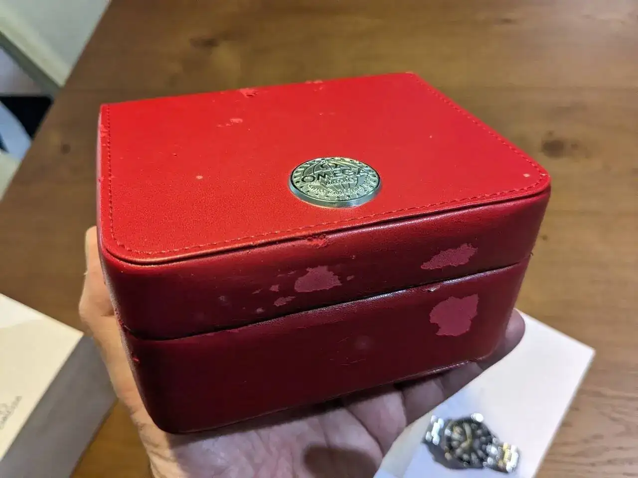Citar negativamente el estado de la caja roja omega, que ya sabeis que envejecen bastante mal, el dia que entró en casa se fue al trastero y me encuentro que se despego en algunas partes la piel roja. Luego tenenmos las típicas marcas de uso muy moderado en brazalete y cierre. Caja en muy buen estado. Nada que destacar de importancia, ni golpes, mellas o marcas de consideración. El estado de marcha es impecable con menos de 5 segundos de variacion diaria.