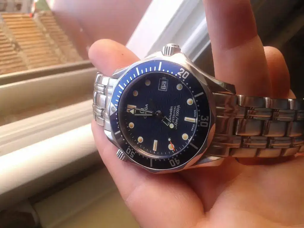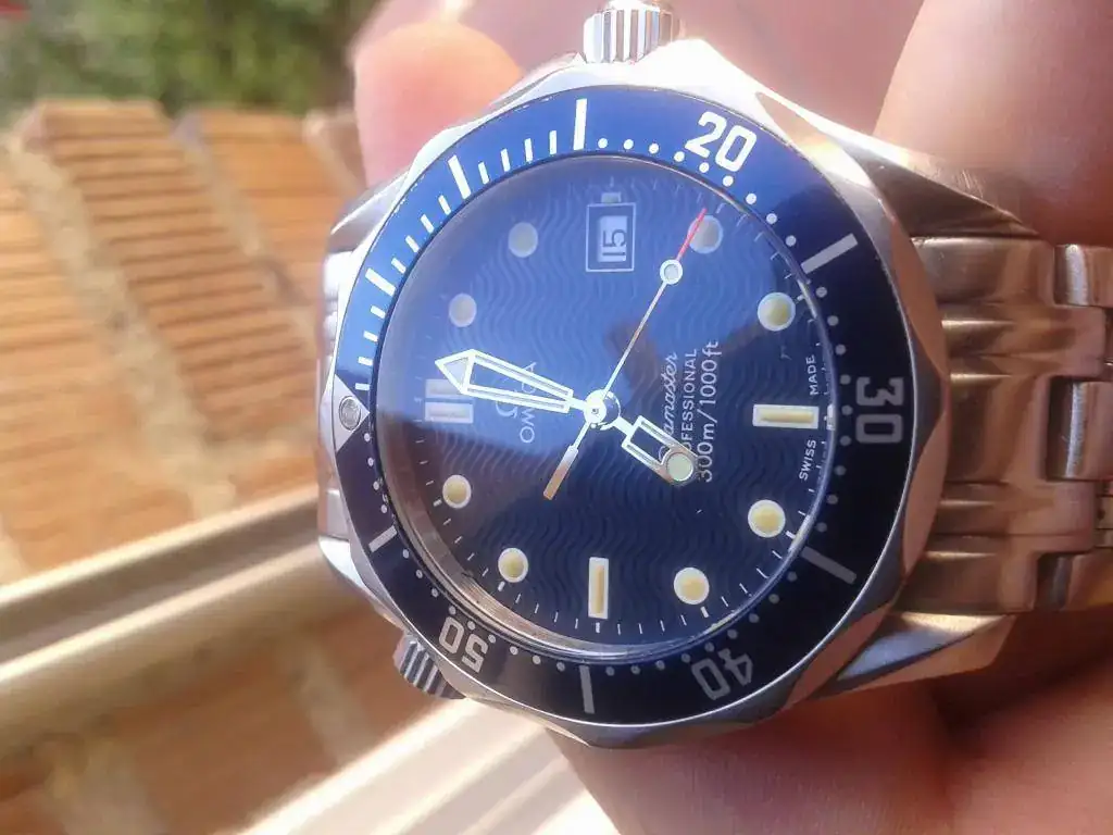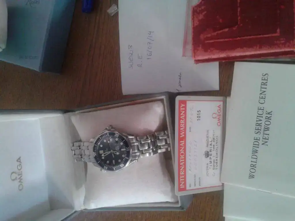 Bueno, pues esta vez saco mi Seamaster. El reloj es del año 96, tiene su caja, tarjeta de garantía, eslabones sobrantes y libritos. La dotación está bastante deteriorada (a mí ya me llegó así), es lo que tiene el paso de los años. La esfera es azul con las míticas olitas. Lo único que señalaría y que podeis ver en las fotos, es una pequeña marquita en el bisel arriba. También me vino así y la verdad es que puesto no se nota mucho. Si alguien estuviera interesado envío más fotos sin problema. Priorizaría la entrega en mano en Madrid, y así veis el estado del reloj.