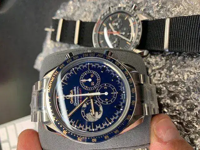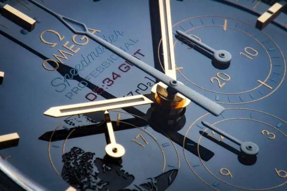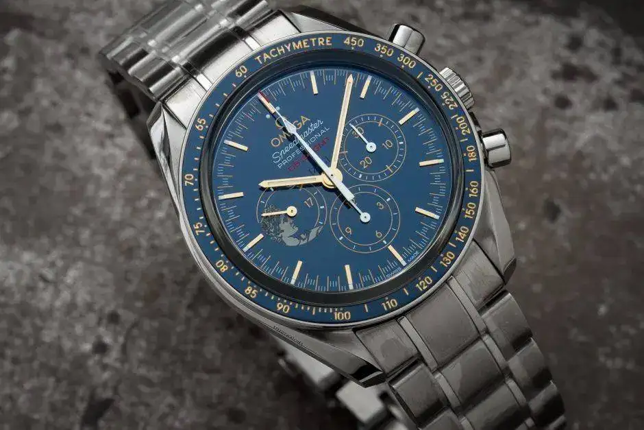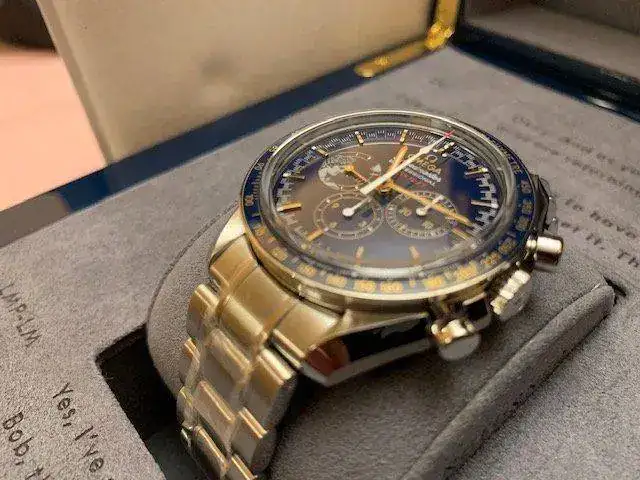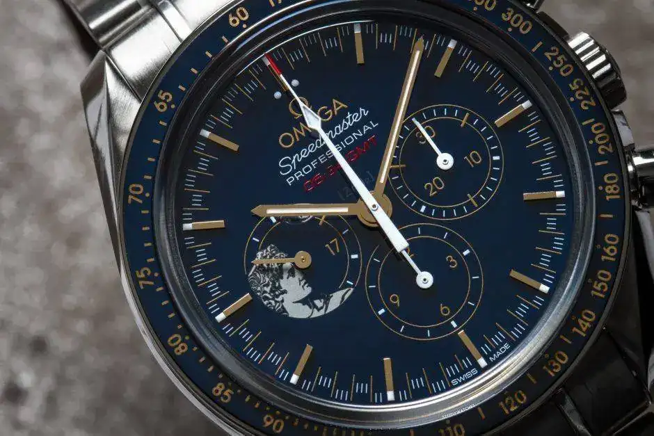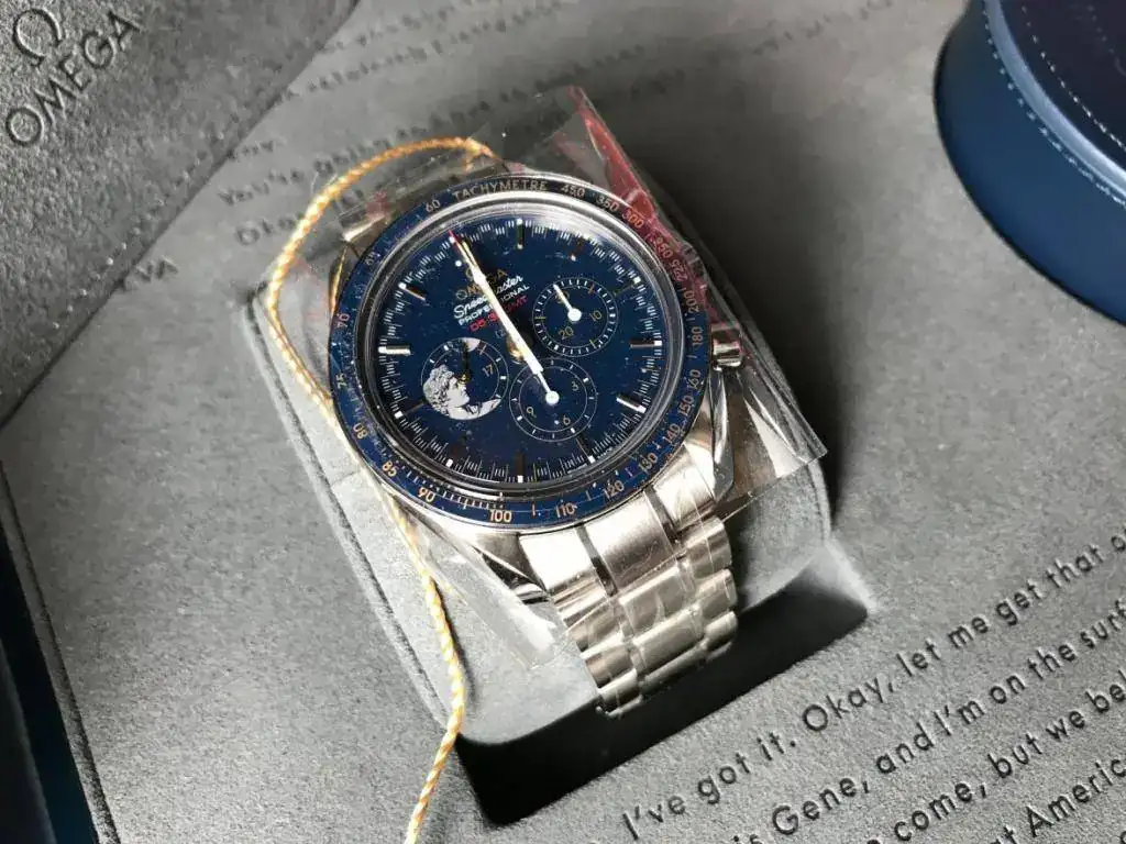La caja, de 42 mm, luce un bisel en cerámica azul pulida, con escala de taquímetro en OMEGA Ceragold™. La esfera es también de cerámica azul pulida, con índices y agujas horarias "Moon" en oro amarillo de 18 qt (el ver el cambio de color de la esfera en función de la iluminación es un auténtico placer). Las agujas horarias están revestidas además con Super-LumiNova. Las agujas de las subesferas son de oro amarillo de 18 qt o están barnizadas en blanco mate y el segundero central de cronógrafo está también barnizado en blanco y tiene punta roja. Cristal de zafiro, no de hesalite, con doble tratamiento antirreflejo.