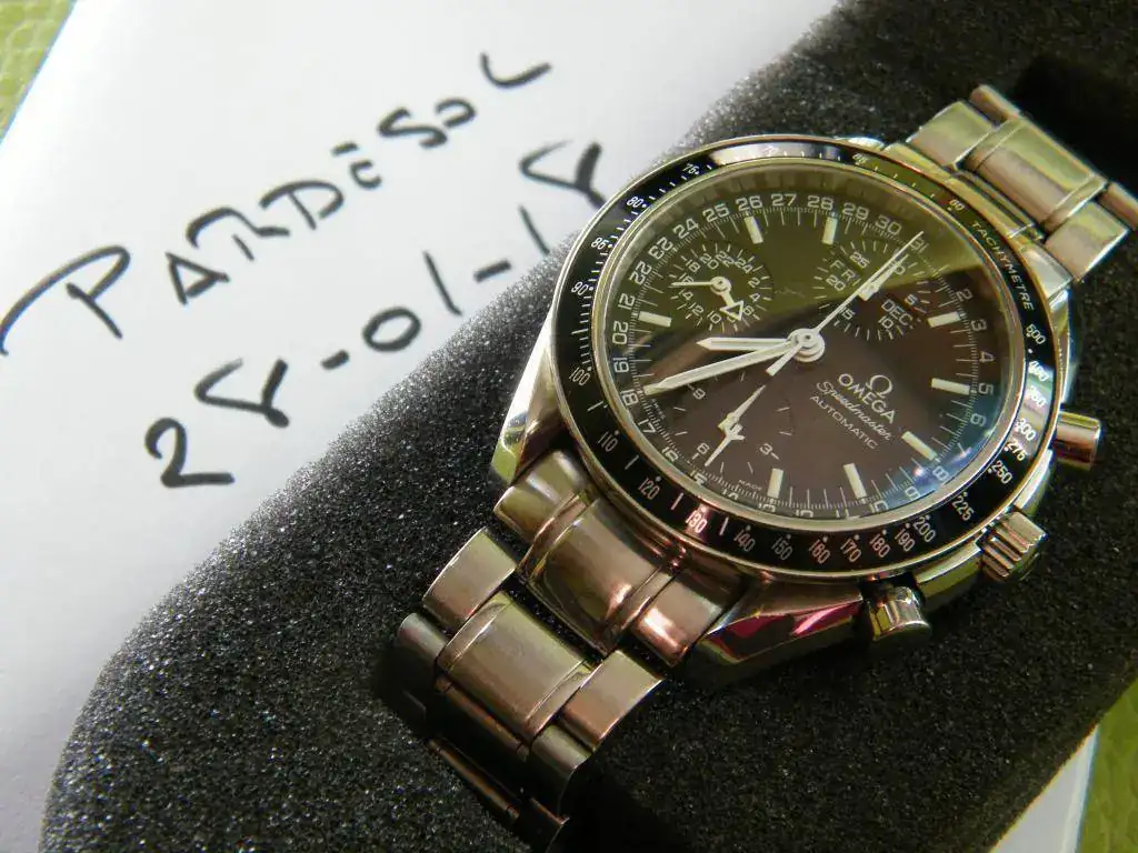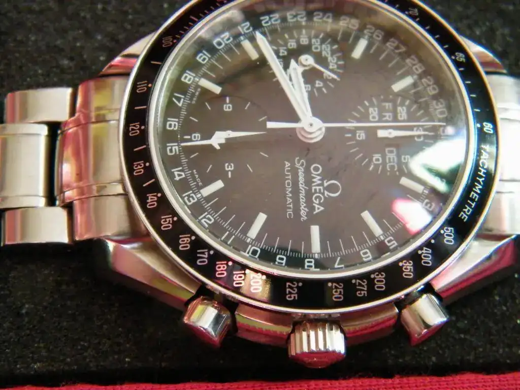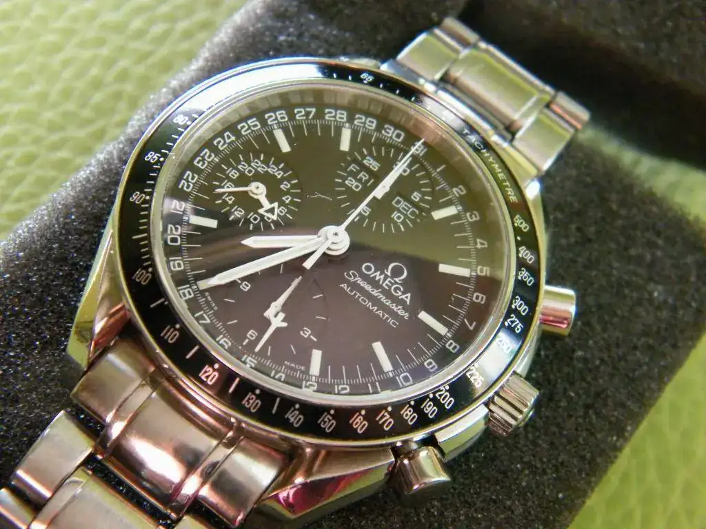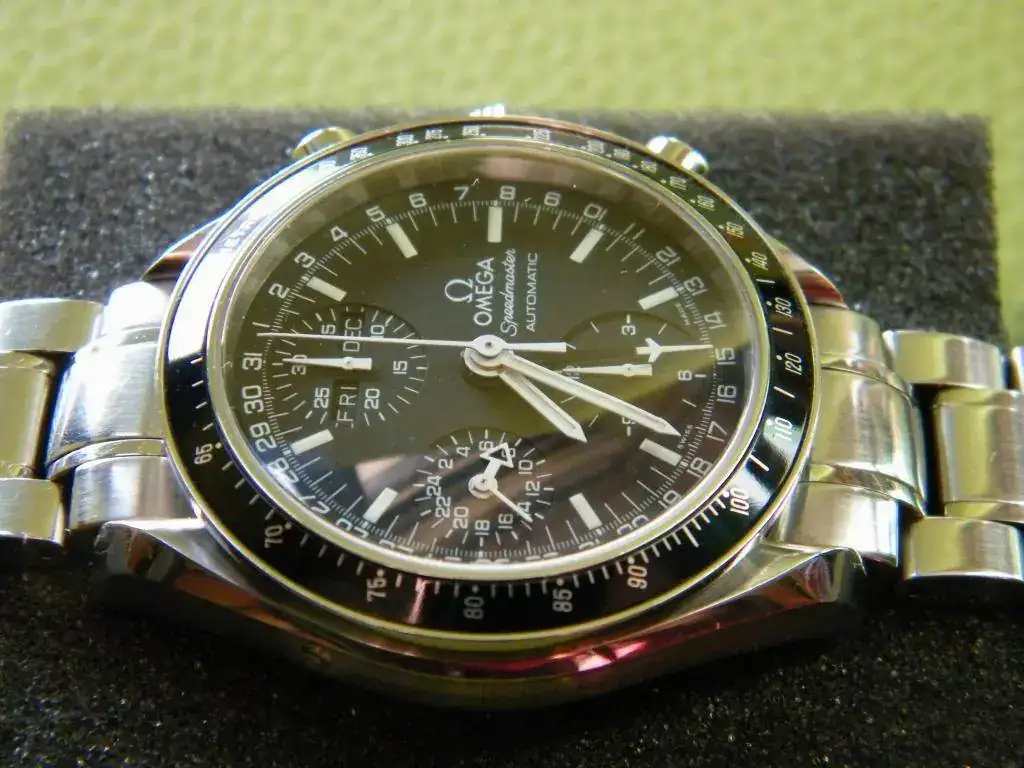 ya no veo ni las ventanas ni la indicación gmt. Se trata de un miembro de la familia de los Speedmaster sobradamente conocido, automático, cronógrafo, indicación gmt y triple calendario. Procedente de un cambio con un buen amigo, se trata de un reloj usado en buen estado como se ve en las imágenes.