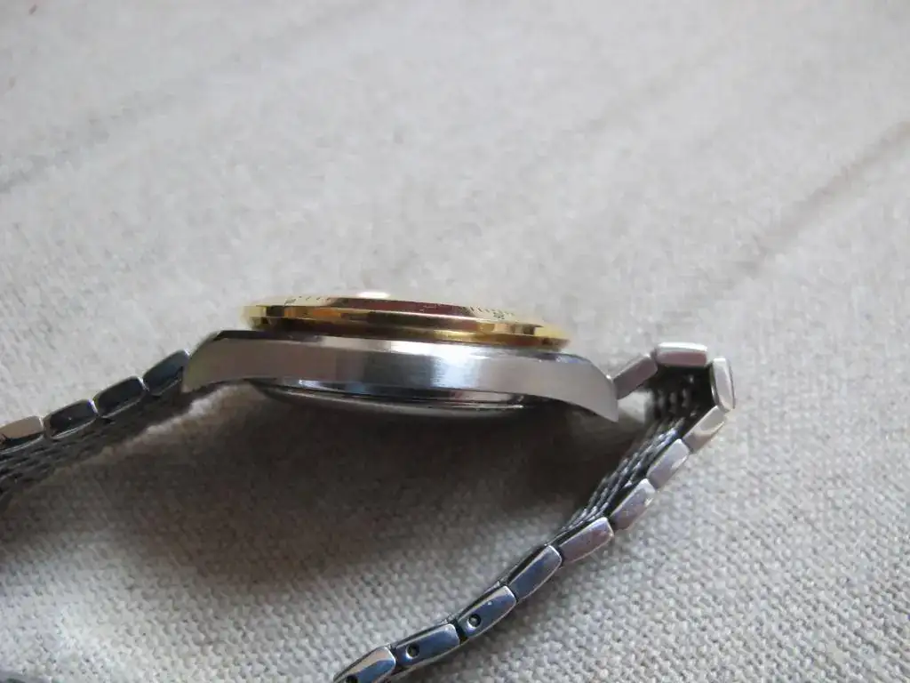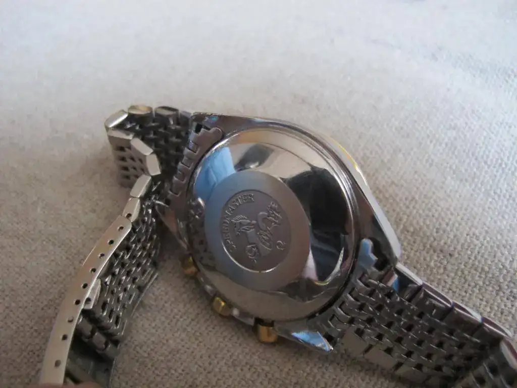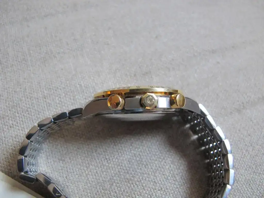 39 mm. de diámetro sin contar corona ni pulsadores con preciosa esfera dorada, cristal zafiro con tto. antirreflejos, calibre Omega 1150 (Valjoux 7750) con reserva de marcha de 44 horas, cronógrafo, fecha y escala taquimétrica. Es un modelo de los años 90, yo lo compré en 2013.