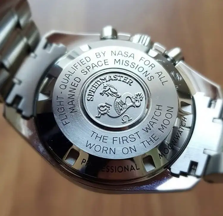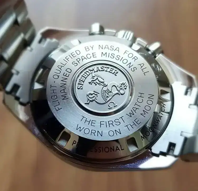 En el caso de mi unidad, ésta lleva hesalite y fondo ciego, a diferencia del doble zafiro, que además lleva el calibre 1863, algo más decorado y mejor terminado que el 1861 que monta mi unidad. El fondo ciego también merece una foto que nos sirve de excusa para hablar de la historia del reloj: el Speedmaster nunca se diseñó pensando en el espacio, ni mucho menos Omega creyó que los astronautas lo utilizarían sobre la superficie lunar. Salió al mercado en 1957, el mismo año en el que la Unión Soviética puso en órbita al Sputnik, el primer satélite artificial. La carrera espacial por aquel entonces apenas había comenzado. La NASA no se creó hasta 1958 y el primer programa espacial tripulado de EE.UU. (programa Mercury) data de 1961. Además, ¿os imagináis lo inútil que es un taquímetro en el espacio?