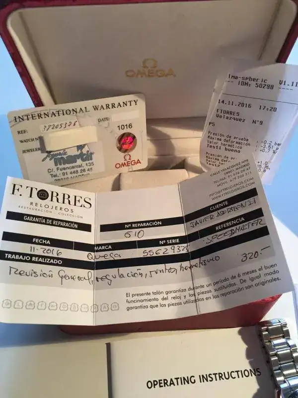 Pasada revisión en Omega en 2013 y nuevamente pasada revisión en noviembre 2016 en el taller de Fernando Torres. Su estado de marcha es excelente. Desde noviembre hasta hoy (01 enero) ha retrasado 1 minuto.