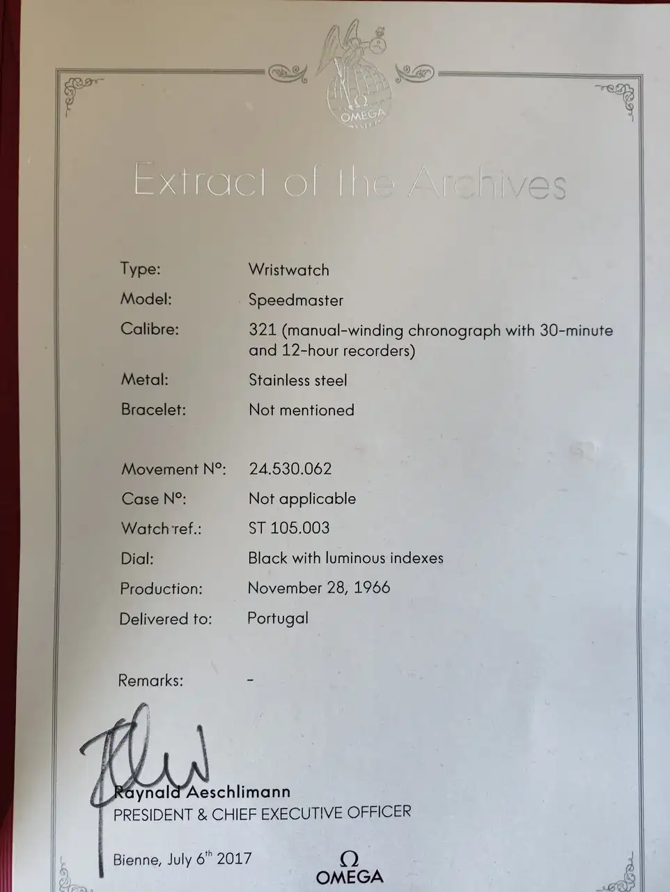 Algunos extras importantes. Brazalete original 7912 con enlaces finales 6. Es un detalle importante. Y el extracto de archivos. Creo que Omega sigue manteniendo desactivada la opción de pedir el extracto tras lo sucedido en una subasta con una pieza (creo recordar un Speedmaster ck2915) que no era lo que debía ser.