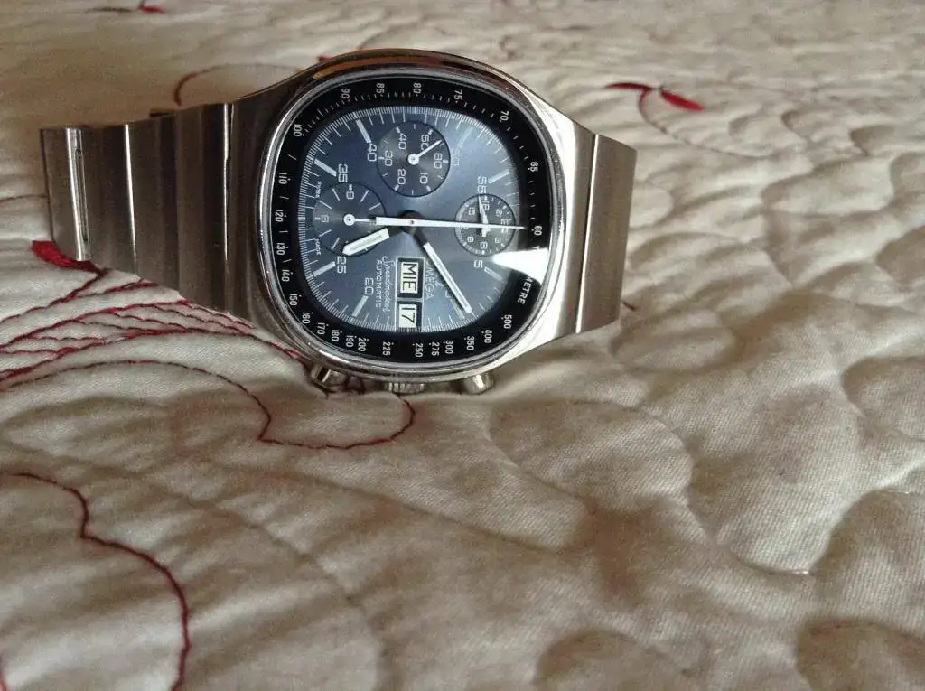 Pongo a la venta con muchas dudas este Omega Speedmaster Mark V Tv Dial con esfera azul, revisado en Bienne recientemente.