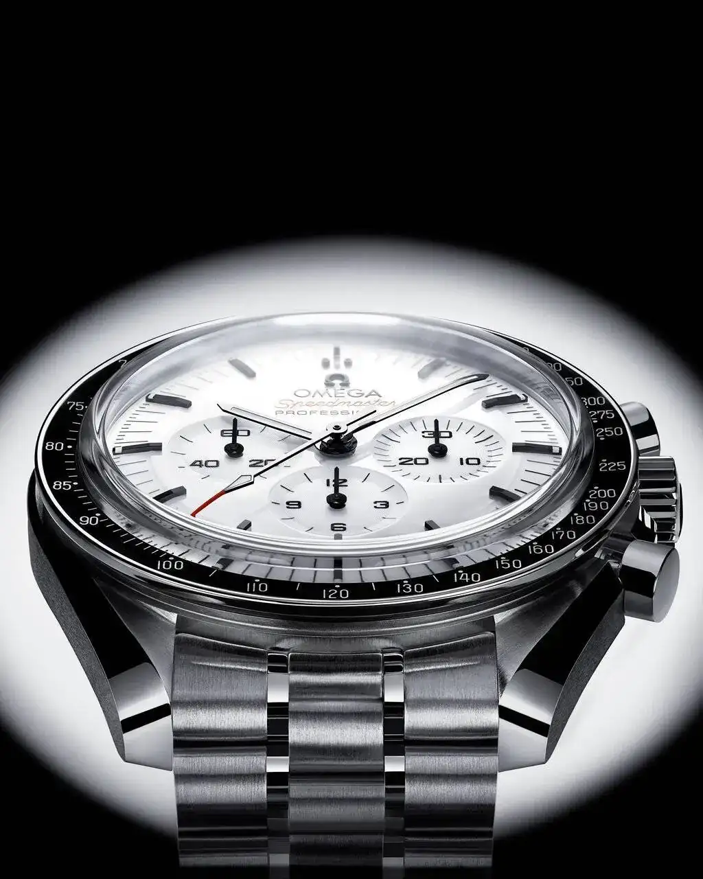 ¿Por qué blanco? La principal inspiración para este nuevo look son los colores blanco y negro de los trajes espaciales de los astronautas, especialmente los que se utilizan durante la actividad extravehicular (EVA), como las caminatas espaciales. Una conexión auténtica después de todo, ya que el Speedmaster Moonwatch ha sido usado oficialmente por los astronautas de la NASA desde 1965 y es conocido como el primer reloj usado en la Luna. Además, las líneas rojas también han aparecido en los trajes desde el Apolo 13 en 1970 para indicar el rango del comandante.