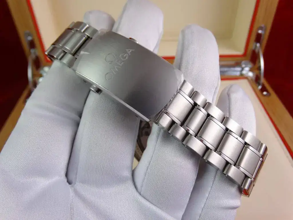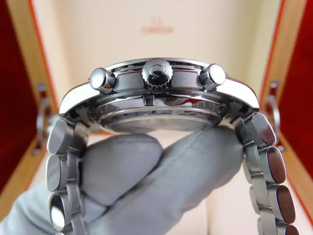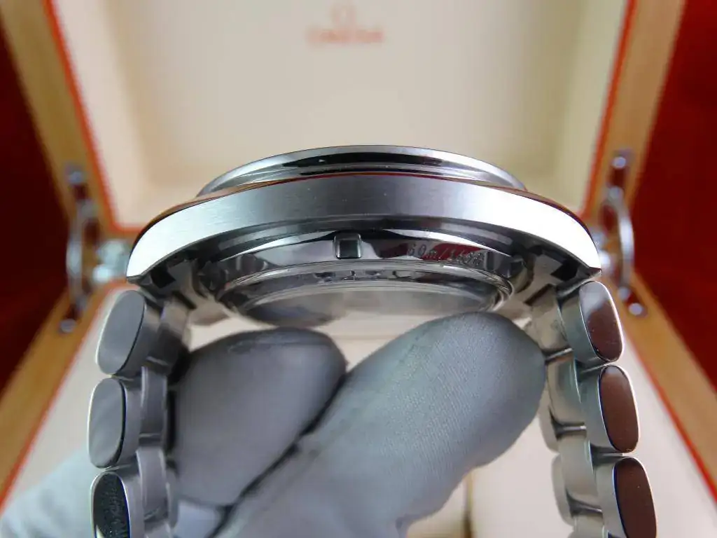 Este modelo incluye lo que muchos desean de un Speedmaster, pero que el Professional no puede aportar: calibre automático co-axial, fecha a las 6, microajuste en el armis y un tamaño muy contundente. Además, aporta un cristal de zafiro por ambas caras, un brazalete con el sello de Speedmaster,