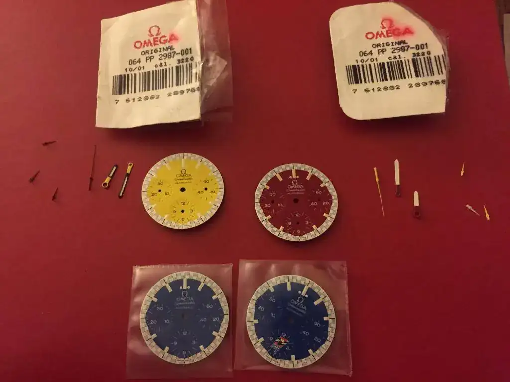 El reloj va con 4 esferas extras, la roja y la amarilla van con las agujas, las azules no.
