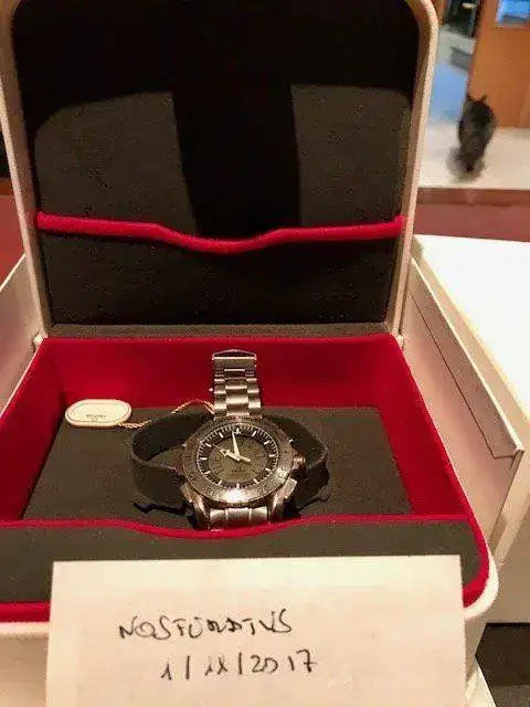 Mi unidad se vendió en Japón en noviembre del año 2000. Al ser un reloj tan difícil de encontrar no es fácil valorarlo. Mientras un 1 generación se puede encontrar por unos 2.000 euros, un 2 completo con armis, caja y papeles no baja de los 3.000 en Estados Unidos. Yo valoro el mío en 2.500 euros que me parece un precio razonable para un reloj muy buscado y extremadamente escaso. Probablemente lo podría vender bastante más caro en el extranjero, pero prefiero que –si es posible- se lo quede alguien del foro que lo esté buscando desde hace tiempo y no lo encuentre. Está perfectamente conservado con algunos pelillos en el titanio, que es un material delicado, aunque he preferido no pulirlo, y tiene recién cambiada la batería. La caja es muy especial porque está forrada con tela empleada en los trajes de astronautas.