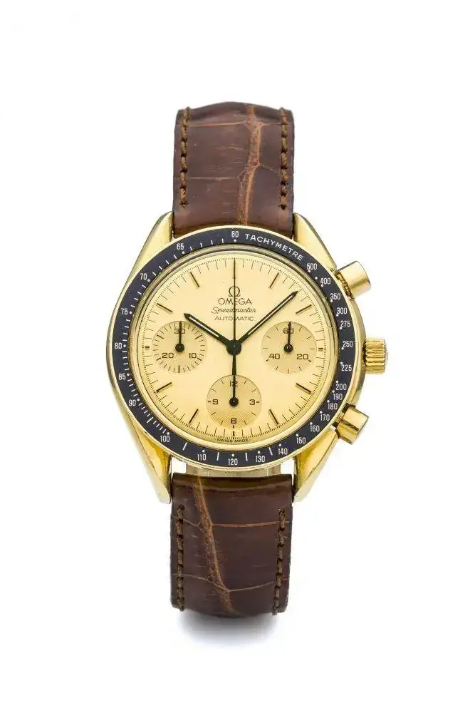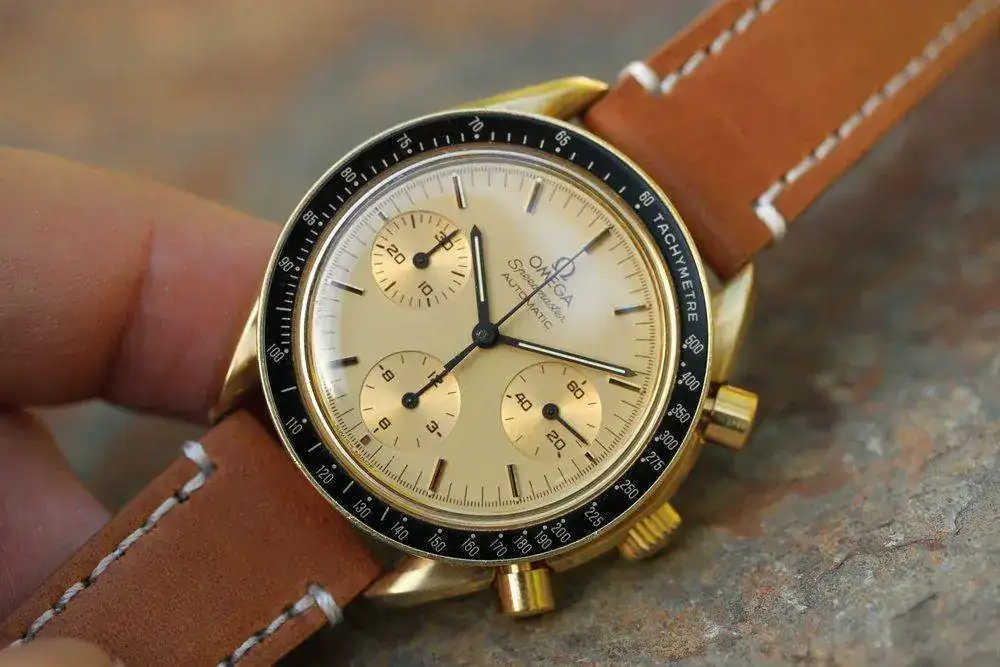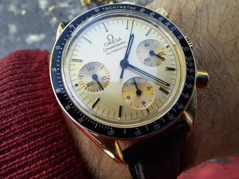 Es un Omega Speedmaster Reduced. La espera dorada es la primera que veo normalmente lo he visto en blanca. Es un buen reloj, aunque a mi personalmente me gusta menos que el Moonwatch. Eso si es mucho más económico y además automático.