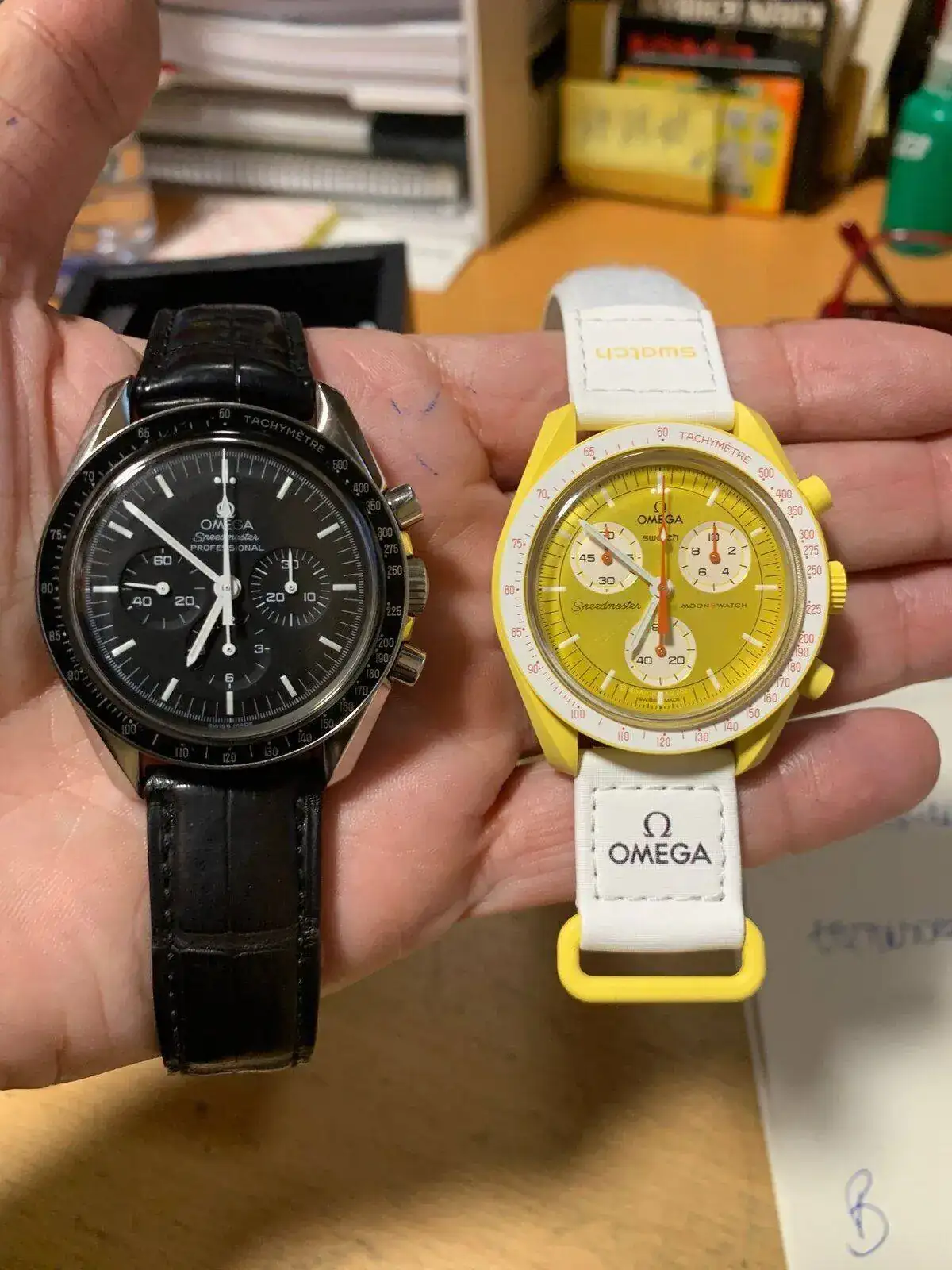 En muñeca el reloj luce y mucho , muy ligero, mas de lo que me esperaba y si lo comparo con los Swatch de mi mujer, supongo que ese plastico cerámico contribuye al peso mínimo y si ahora me pusiera de golpe el Ploprof posiblemente me lesionaría la muñeca. El reloj es un Swatch en acabados y mecanismo no lo olvidemos aunque luzca el logo de Omega en esfera y correa pero es espectacular!!!!!! Un diseño Speedy 100x100 de colores!!!! Y que a la que pueda cuando se pase esta vorágine es muy posible que también entre el rojo marciano!