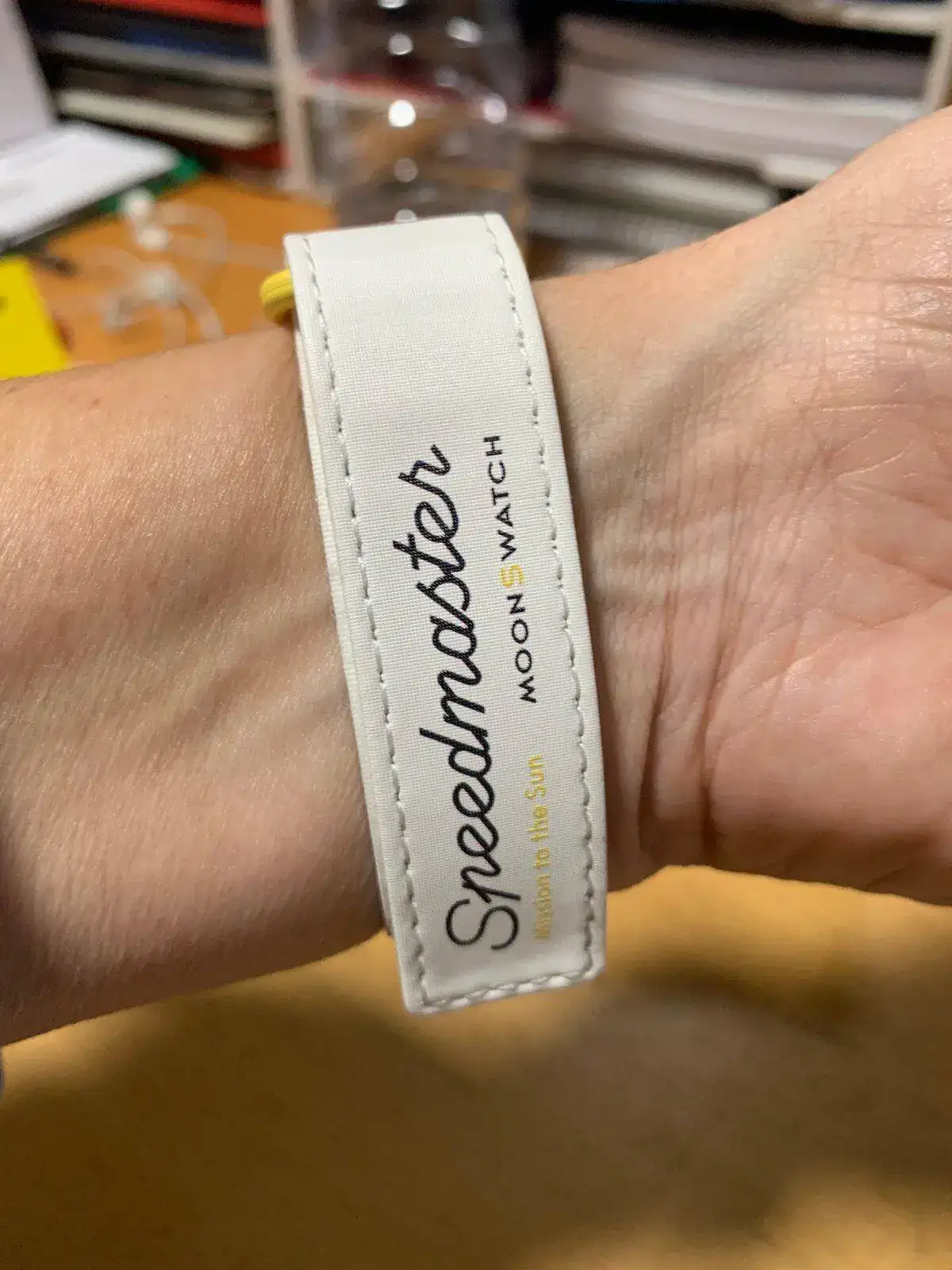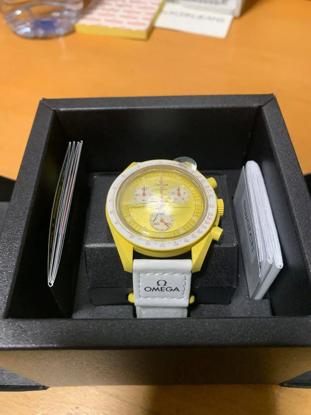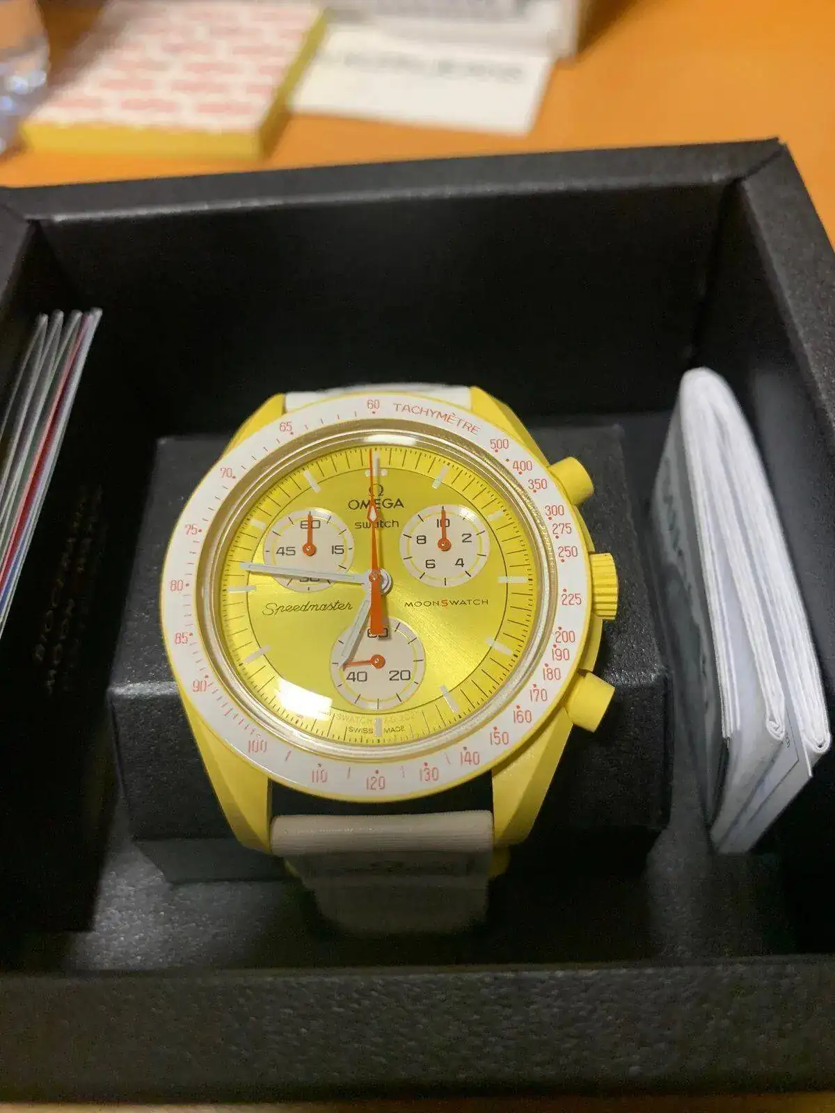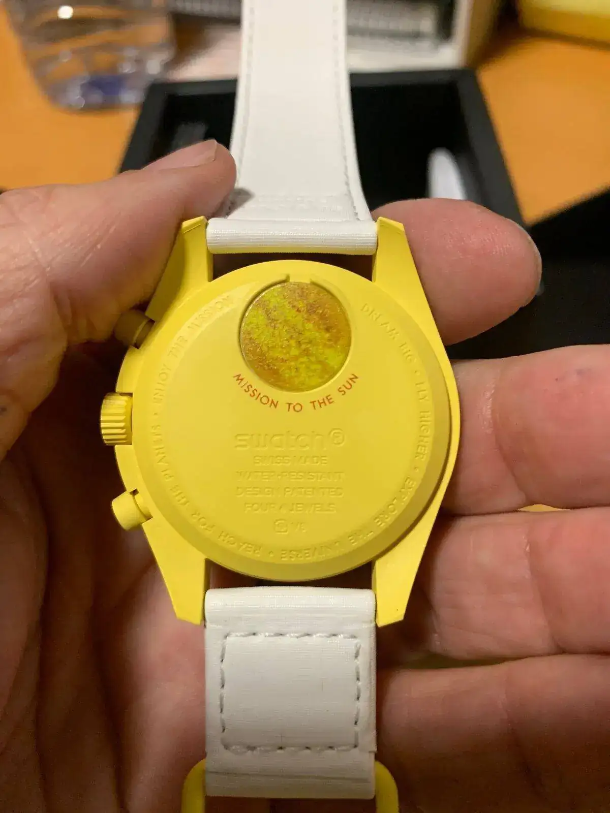 A las 14:30 han comenzado a llamar por orden de tres en tres y acompañados de personal del ECI hasta el corner de Swatch para elegir y comprar el modelo, solo había seis colores disponibles y entre ellos el Mission to the Sun que era una de mis preferencias tras el rojo de marte, y aquí lo tenemos.