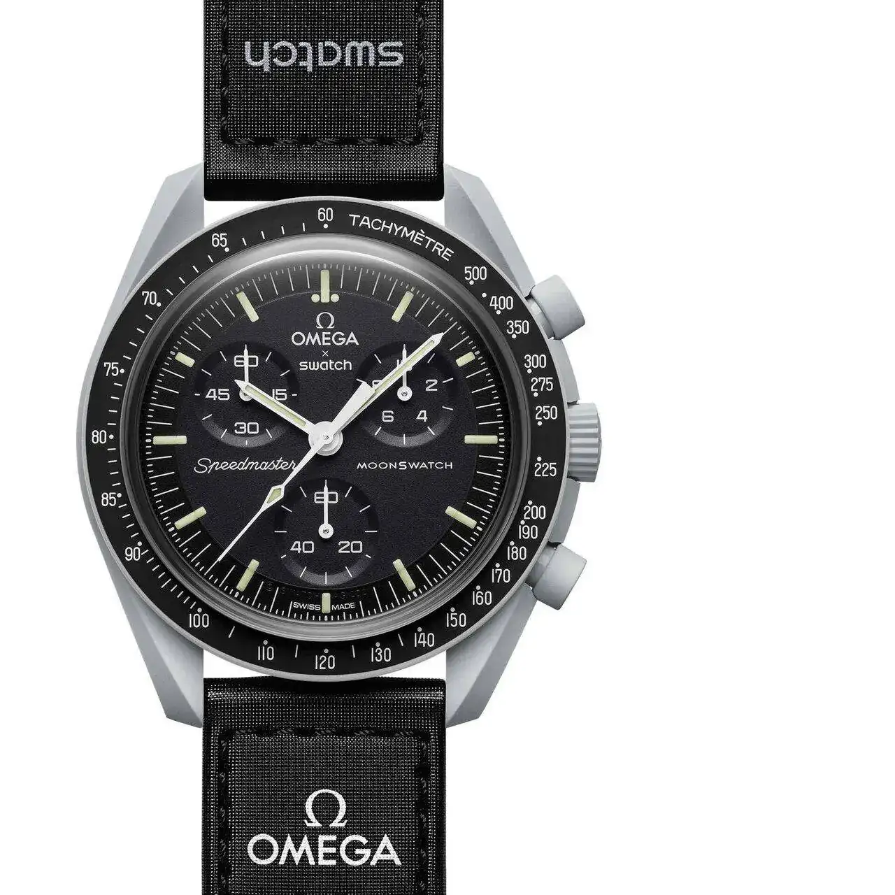 Omega x Swatch Speedmaster moonswatch de 42mm es una colabo de omega con swatch y han creado un reloj de 250 euros ligero (30gr) hecho de plástico cerámico y realmente no ofrecen detalles del bisel y cristal pero la gente en reviews dicen que el bisel es de plástico sintético como la caja y el cristal de acrílico. Lleva un movimiento puramente de cuarzo y decir que está agotadísimo actualmente y no se sabe cuándo repondrán stock aunque se sabe que lo harán.