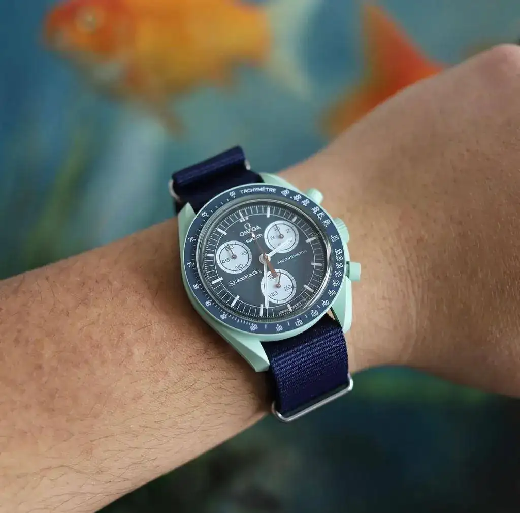 Me encanta cómo quedan con la nato, a ver si salen ya online y se acaba tanta tontería de reventa y gestión turbia por parte de las tiendas SwatchBuceando por internet, he encontrado varios Moonswatch a los que les han puesto natos, correas de caucho o piel. Adjunto varias imágenes para que veáis el cambio de estética.