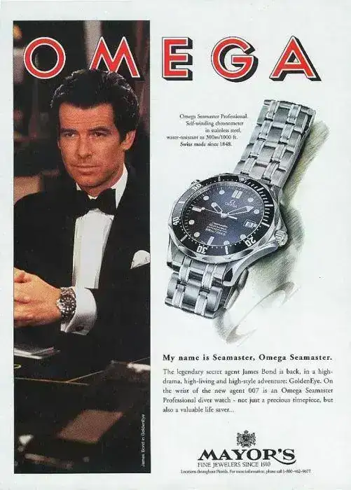Siguiendo un orden cronológico, el primer Omega que apareció en la muñeca del agente secreto del MI6 fue el Seamaster 300 M Chronometer con movimiento de cuarzo y referencia 2541.80.00, que lo hizo en GoldenEye (1995) de la mano de Pierce Brosnan.![]()