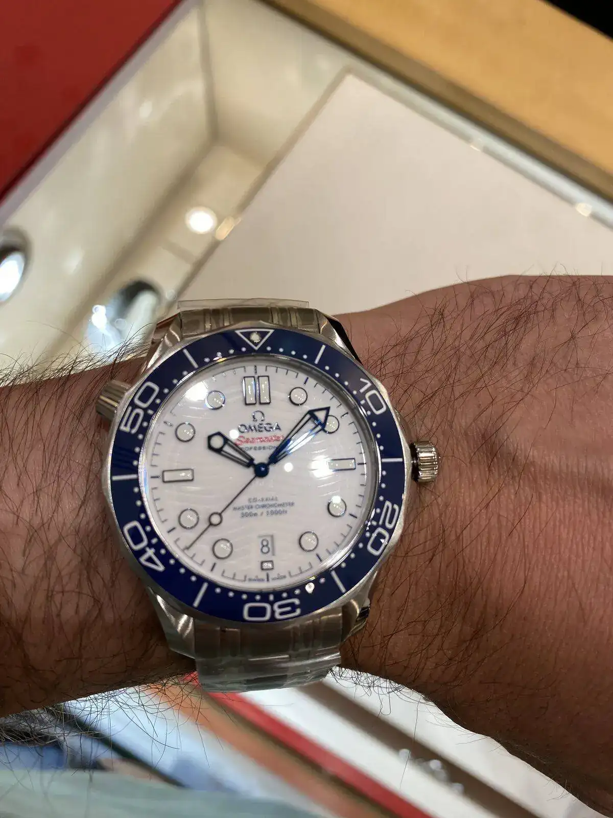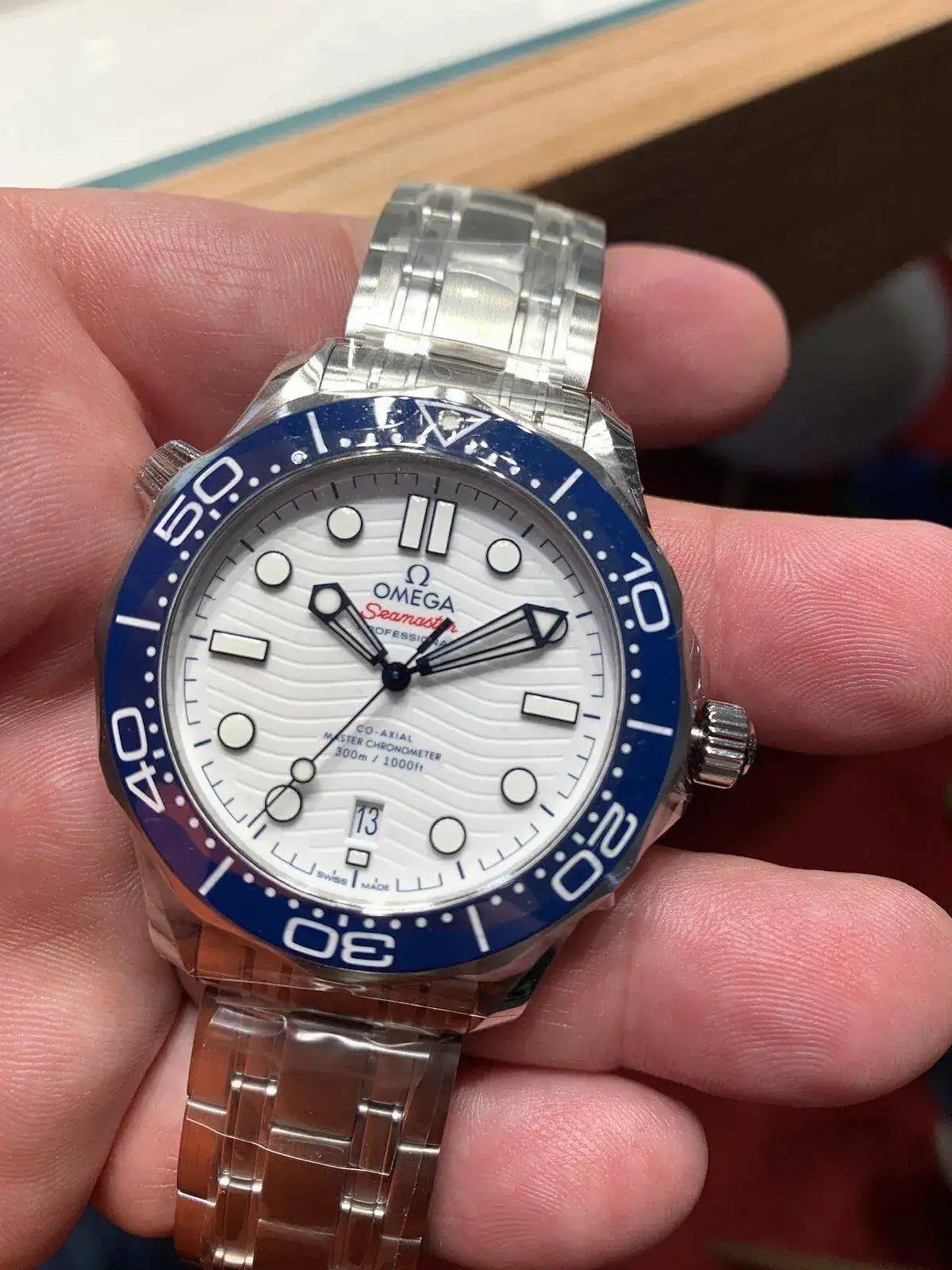 Igualmente, la caja de 42 mm del OMEGA Seamaster 300M Tokyo 2020 también es de acero, y lleva un aro de bisel en cerámica azul, con una escala de inmersión en esmalte blanco. El acero también se utiliza para el brazalete pulido y cepillado. La esfera está hecha de de cerámica blanca pulida, con una profundidad adicional proporcionada por las olas grabadas con láser. La ventana de fecha situada a las 6 h y la palabra Seamaster resaltada en rojo junto con los índices y las agujas azulados rellenos de Super-LumiNova blanca completan el diseño. Detrás del cristal de zafiro del fondo de la caja, con el emblema de Tokyo 2020 transferido, se encuentra el movimiento OMEGA Co-Axial Master Chronometer calibre 8800, certificado oficialmente por el Swiss Federal Institute of Metrology (METAS).