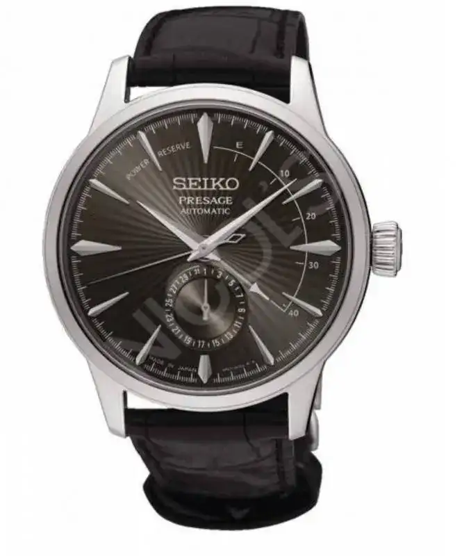 Reloj Seiko Presage, Calibre 4R57. Reloj Automático, con calendario a las seis e indicador de reserva de marcha. Caja de acero de 40.5mm con cristal de hardlex. Piel negra y cierre desplegable.