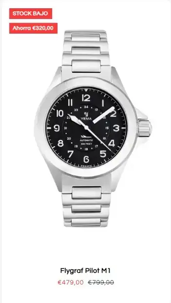 Hoy de camino al trabajo, me ha salido un anuncio de este Yema Flygraf M1 a 479€. La estética del reloj me gusta, me recuerda a un khaki pero menos "refinado". He visto que es un 300m por lo que parece un reloj para cualquier ocasión en toda regla.