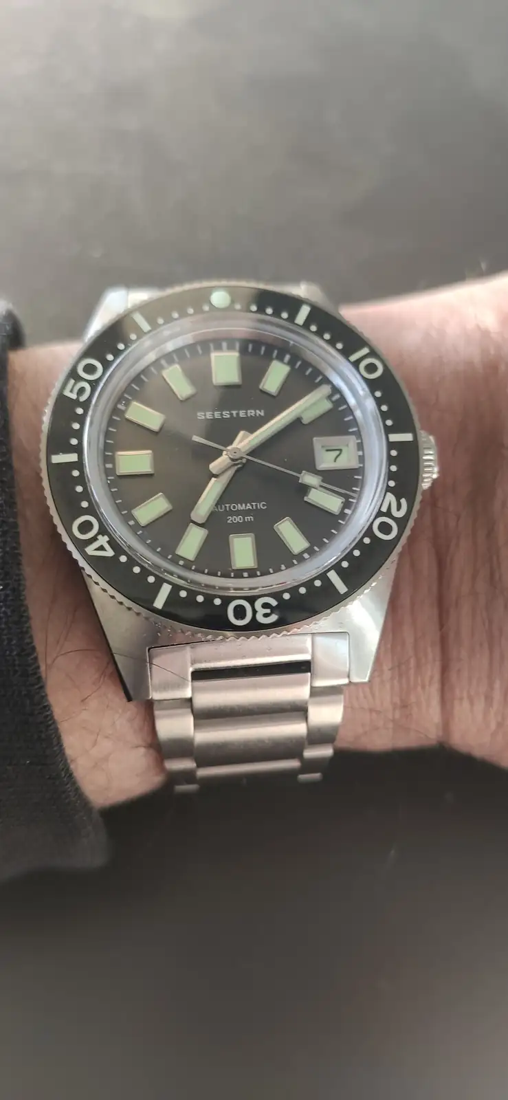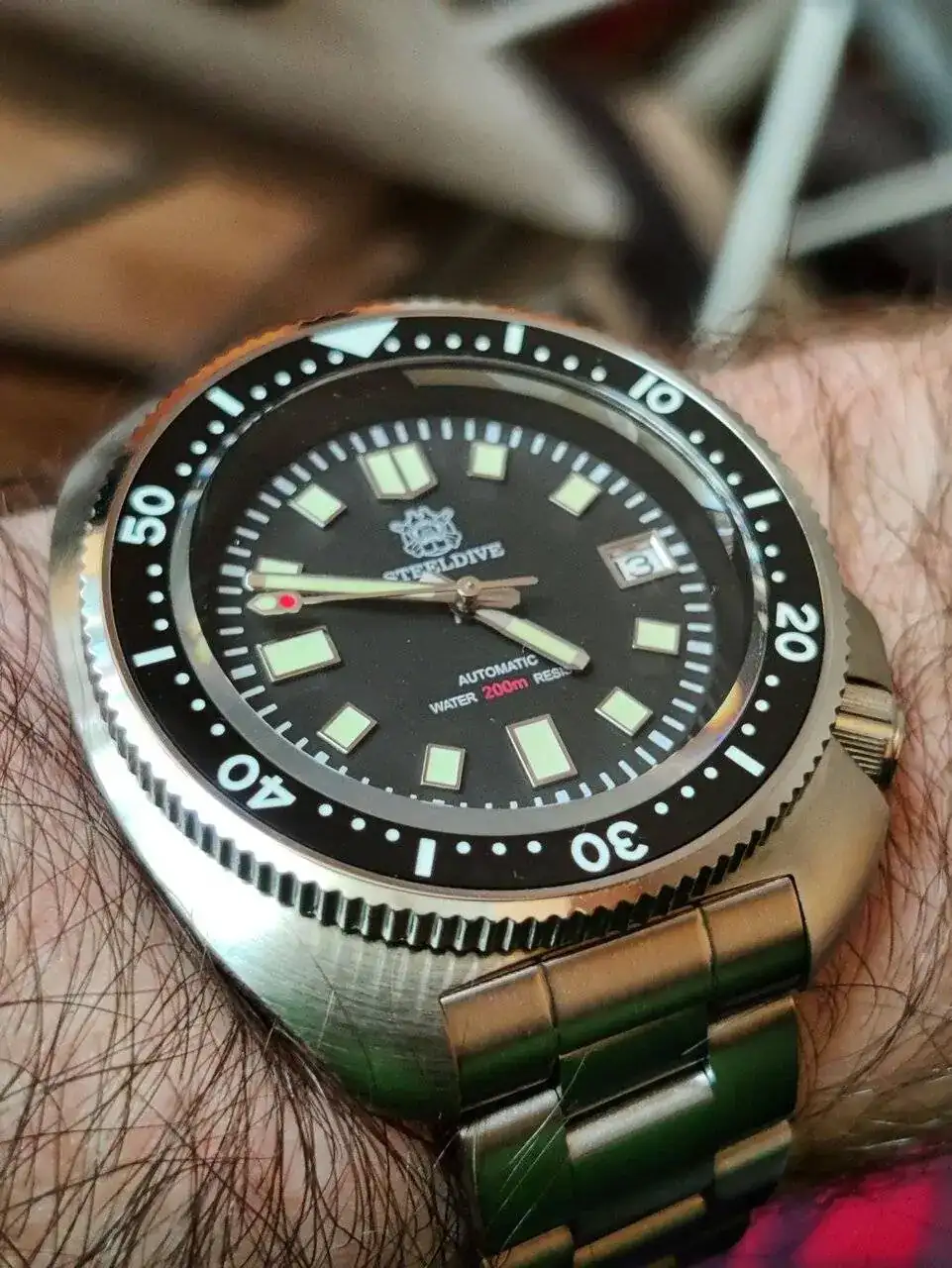 Hoy estrené otro , porque lo tengo en azul y verde y por solo 58 euros no pude resistirme de tenerlo en negro . A disfrutarlo!!, a mi me han salido todos bien.Al hilo de los homenajes/copias yo he recibido hace 2 días un steeldive capitan Willard, me he estado aguantando mucho tiempo por el tema moral, pero al final ha caído por 2 razones, la primera pq pagar 1450€ por el original me parece demasiado y segundo pq me calenté viendo videos de YouTube que hablaban maravillas, y tienen razón es un relojazo por los 78€ que he pagado, la caja, el lumen, zafiro, bisel de cerámica y movimiento Seiko, hasta el broche del armis es mecanizado, en fin que estoy contento pero no lleno, así que lo mismo un día me tiro a la piscina y voy x el original, así es la vida...