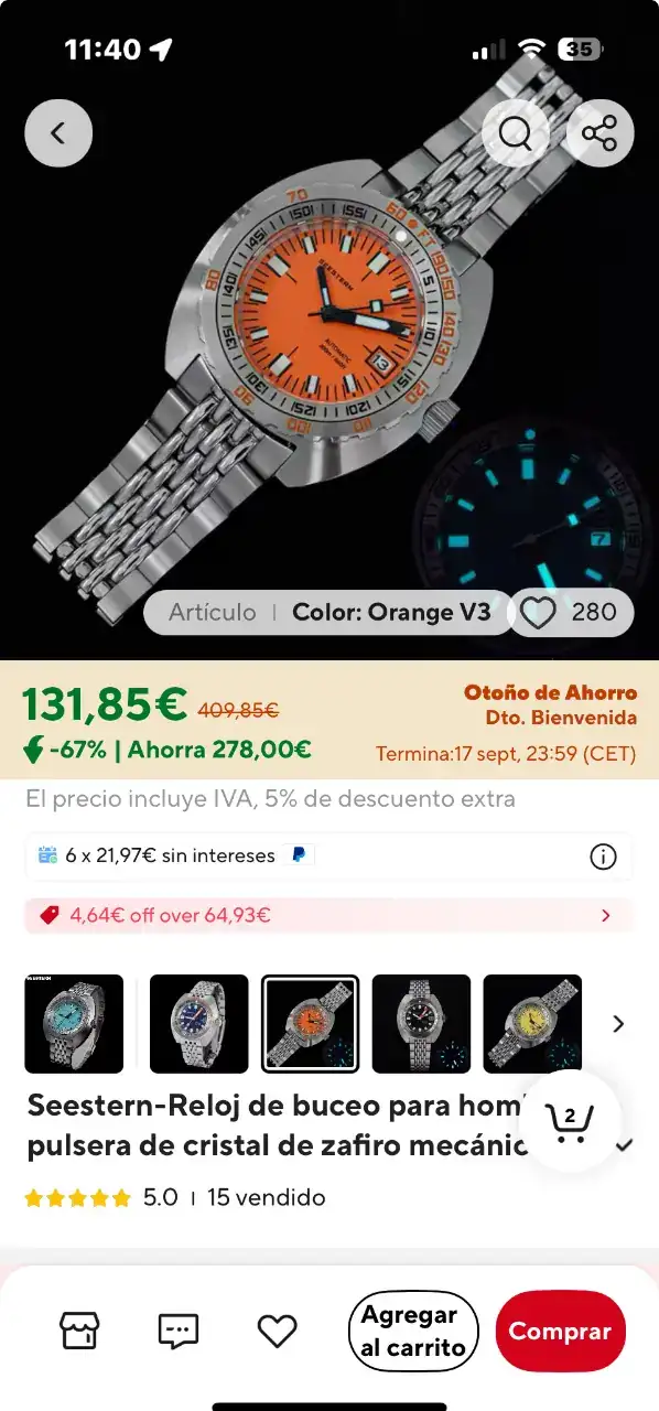ayer lo vi a 54 euros, tengo el verde desde junio y estoy flipando (costó 60e) lo bueno que es por ese dinero. me dan ganas de ir a por el negro pero como empiece a comprar no paro... Me he puesto un limite de 1 reloj al año o si no, los relojes me echan de casa... a lo mejor para reyes y aprovehcando ofertas que seguro que sacan por black friday en aliexpress o el tipico 11.11, puedo convencerme a mi mismo y a la parienta para pedir otro...Hoy estrené otro , porque lo tengo en azul y verde y por solo 58 euros no pude resistirme de tenerlo en negro . A disfrutarlo!!, a mi me han salido todos bien.