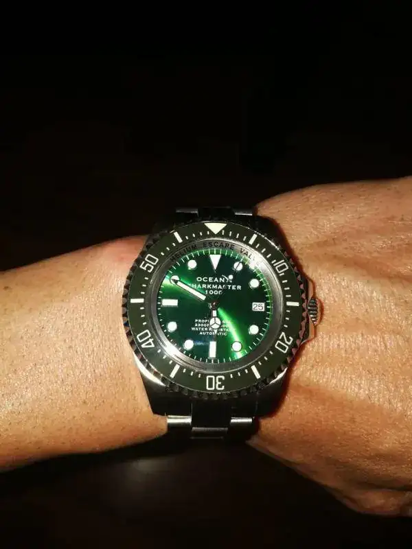 Lo primero decir, que tenía bastantes ganas de que entrara mi primer verde en la caja... Así que después de bichear el foro y escuchar distintas opiniones, aproveché y me lancé a la conjunta que se hizo en el Fcv...Una vez recibido y puesto, el reloj derrocha calidad por los cuatro costados y es bastante contundente...El tono verde de la esfera, según se vea a la luz varía...El único pero, es el cierre del armis, lo noto bastante endeble y el tacto latoso, se merecía algo más, en mi opinión...