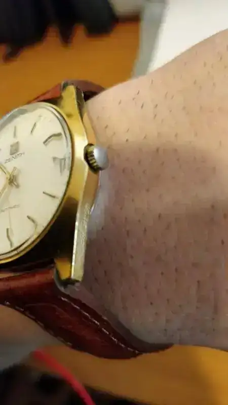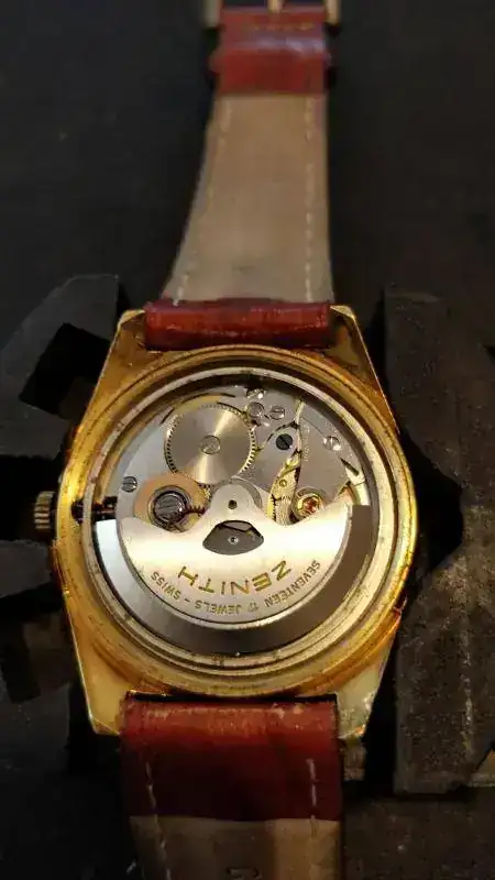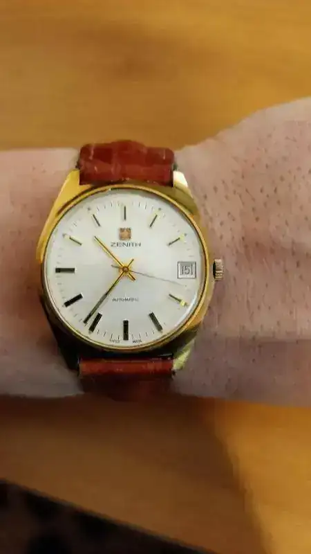 Me gustaría si me pudieseis ayudar a identificar con precisión un Zenith automático. Mi impresión es que es un calibre 2572PC de finales de los 70. Creo que la corona no es original (no está grabada ni parece cerrar del todo), ni la correa ni el cierre. Dicha corona tiene 3 posiciones: cerrado, ajuste de tiempo y ajuste de fecha. Me llama la atención que el movimiento no se detiene en ninguna de las tres posiciones. ¿Es normal?