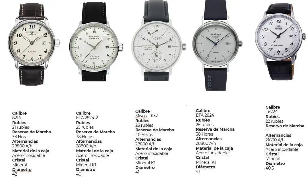 Bien paso al asunto; estoy barajando la posibilidad de adquirir un zeppelin o un iron annie, de mecanismo automático. Me gustan de estilo clásico y con números arábicos, de esfera blanca, caja color plata o cobre y correa negra o marrón. Los modelos que tengo en mente estéticamente, ya que no tengo conocimientos suficientes como para diferenciar la mecánica, son Zeppelin LZ 127 (aunque la esfera no es blanca y las agujas no son finas), y varios modelos Iron Annie, principalmente los modelos Bauhaus 5056-1 y Bauhaus 5066-1 por tema de presupuesto. También me gusta un modelo de Orient, concretamente el modelo bambino V5 (RA-AC0003S10A) pero creo que es bastante difícil conseguirlo, almenos yo no lo he sabido encontrar en ninguna tienda en Zaragoza o alrededores.
