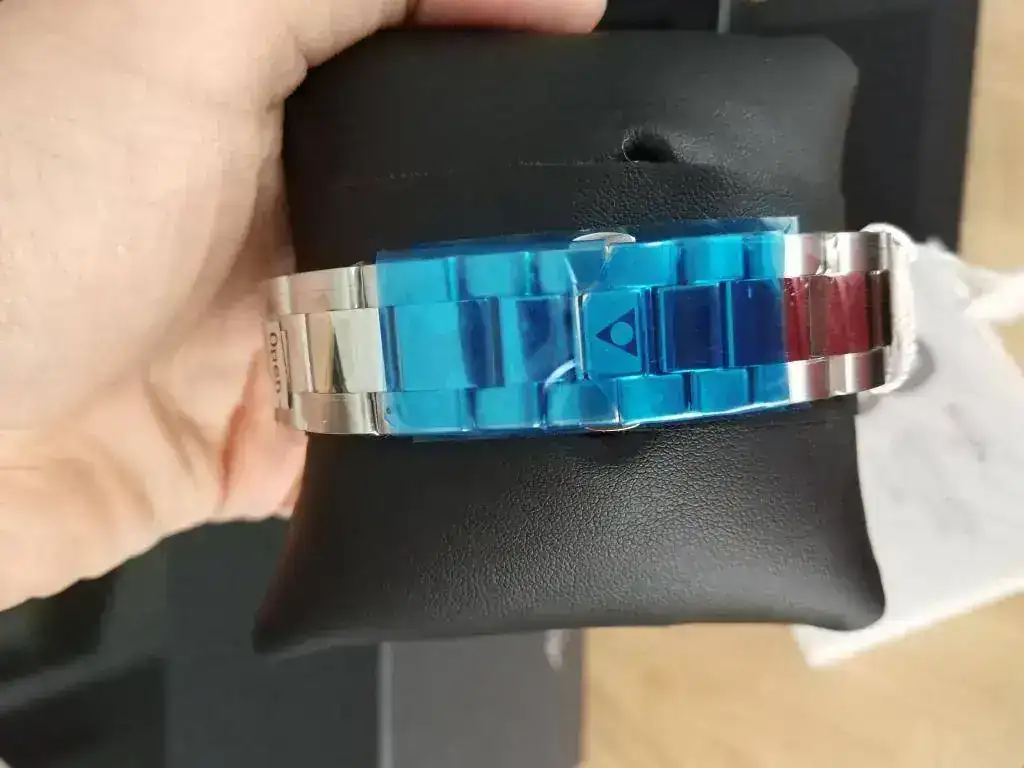Su brazalete de acero macizo es súper cómodo y el cierre de mariposa de muy buena calidad. La tapa inferior es de acero, con un bonito relieve.