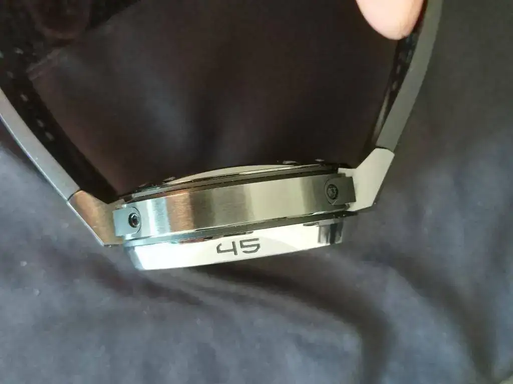 Las medidas son proporcionadas, tratándose de un reloj de 43,8mm de bisel y 48mm de caja incluyendo las protecciones laterales, si bien, su sistema patentado de asas móviles hace que se adapte desde las muñecas más pequeñas como la mía (16cms), hasta las más gruesas.