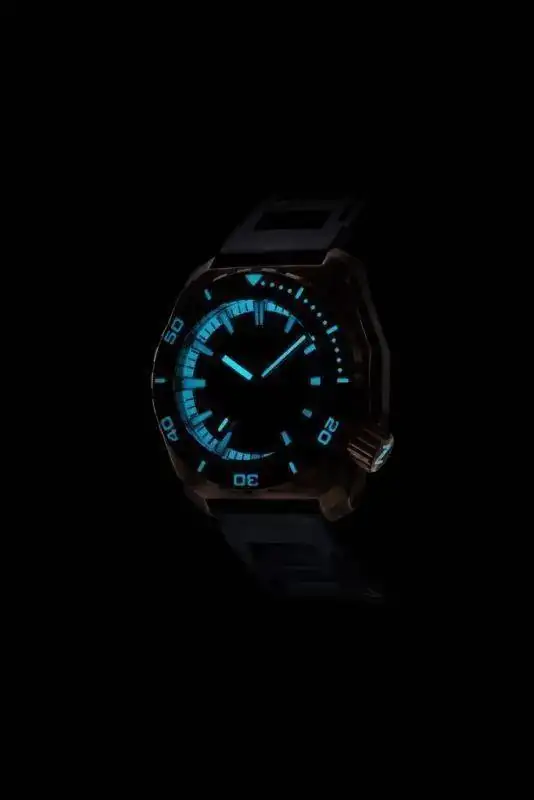 Dial con luminiscencia Superluminoca BGW9 en la escala exterior y Superluminova C3 en agujas y marcadores (en modelo con Dial Azul todo es BGW9)