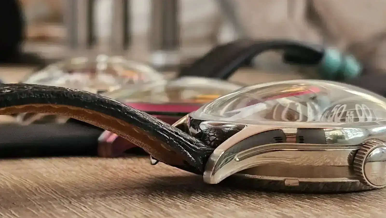 En lo que respecta al cristal, en mi honesta opinión los zafiros en domo son casi siempre una mala decisión salvo que formen parte de la identidad del reloj. Son muy, muy, reflectantes y en estos Oreto no es una excepción. Los he puesto junto a dos relojes míos con un cristal con domo para que comparemos.