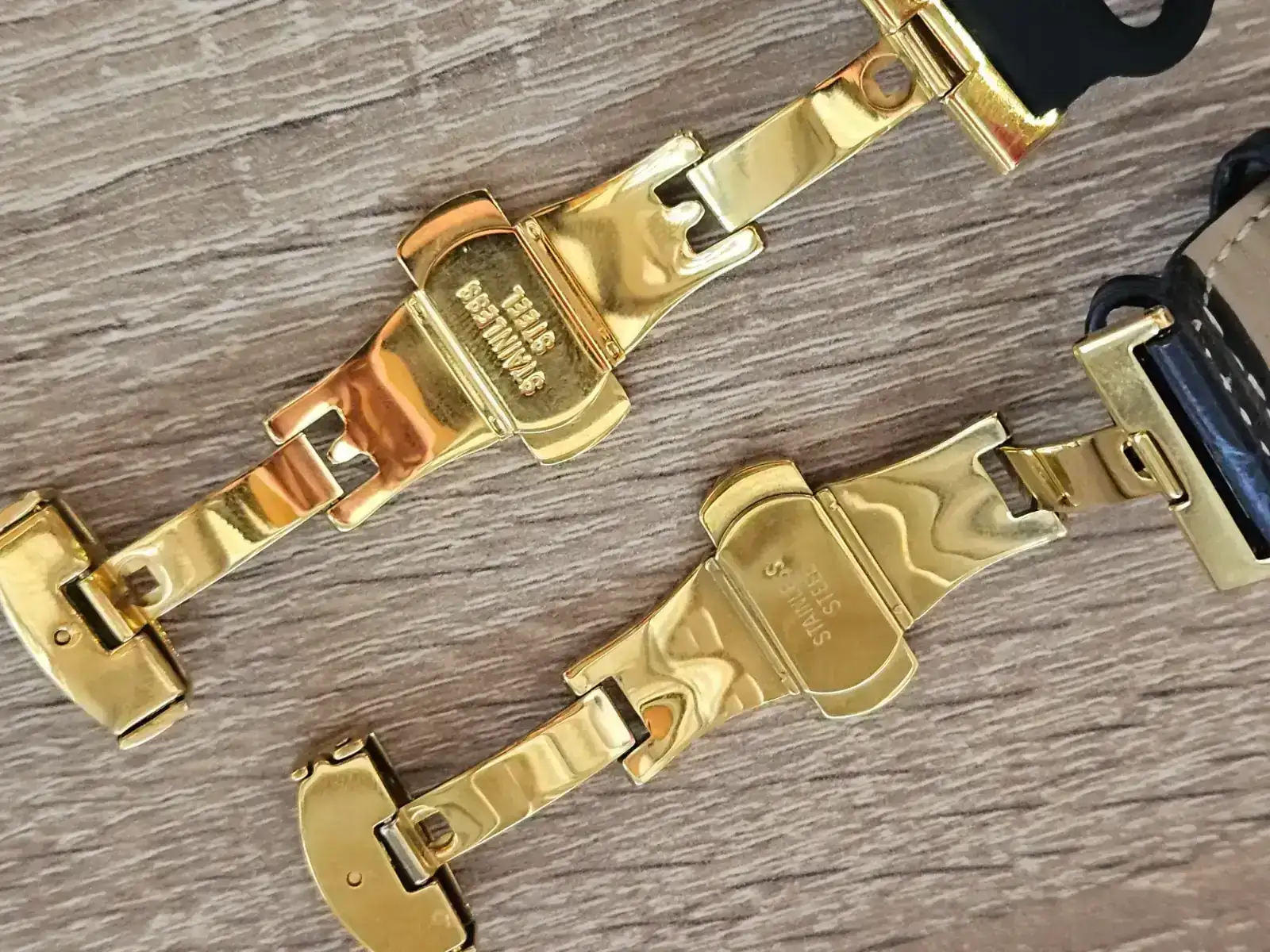 El de arriba es el de Oreto y el de abajo de una correa de aliexpress. El de Oreto tiene un tenue perlage y un grabado de "stainless steel" más profundo, por lo que parece de una categoría de calidad superior al que tengo pero presenta las mismas holguras.