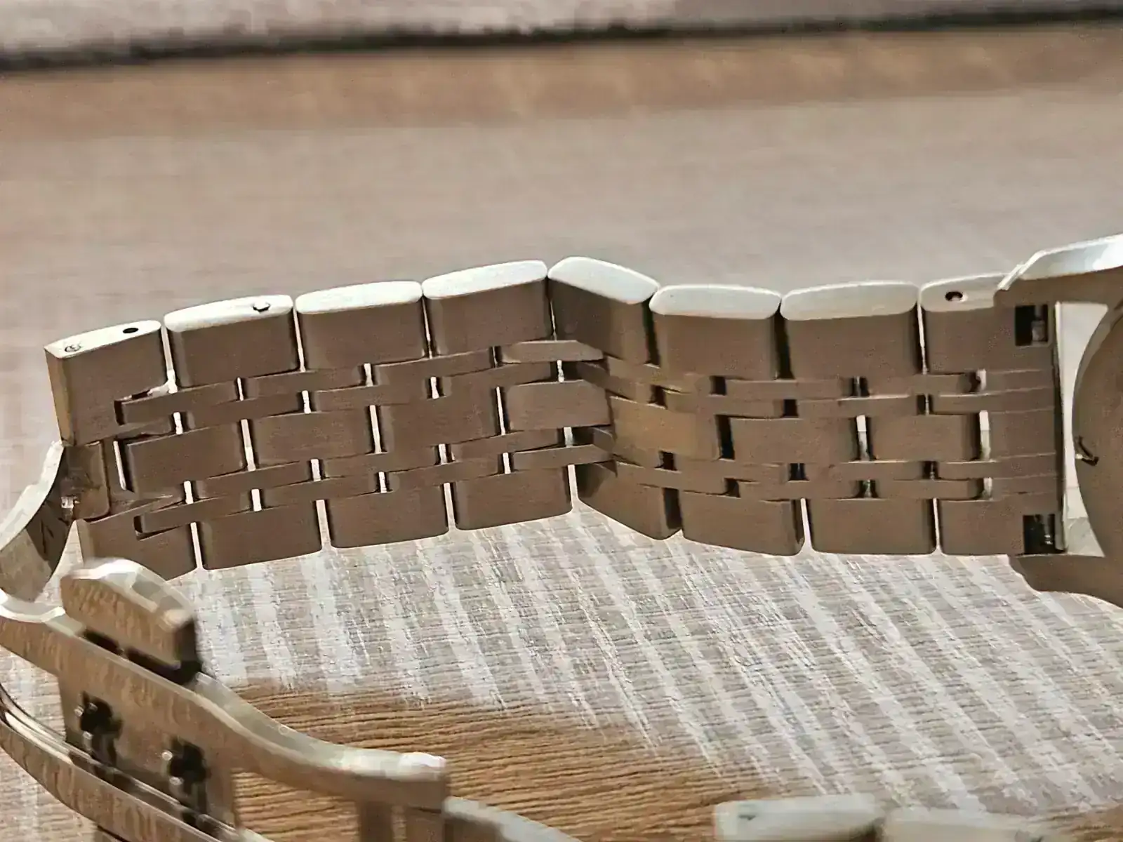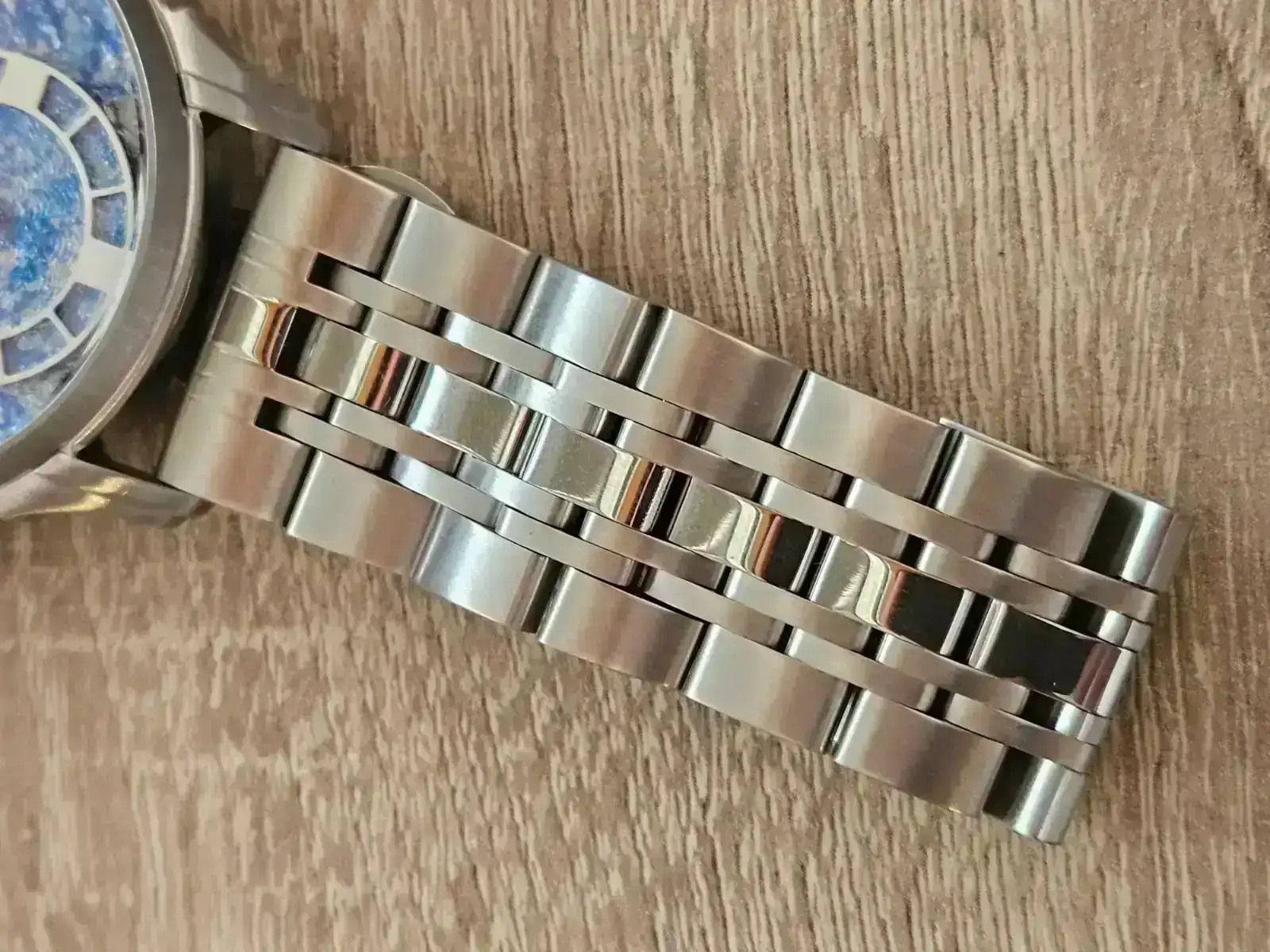 El brazalete, con el mismo cierre que las correas, es algo mejor, pero lo veo justito. Todas sus partes son macizas, tiene pulidos y cepillados, no tiene excesiva holgura, pero ese cierre básico de mariposa lo perjudica enormemente. Además, el interior se siente basto.