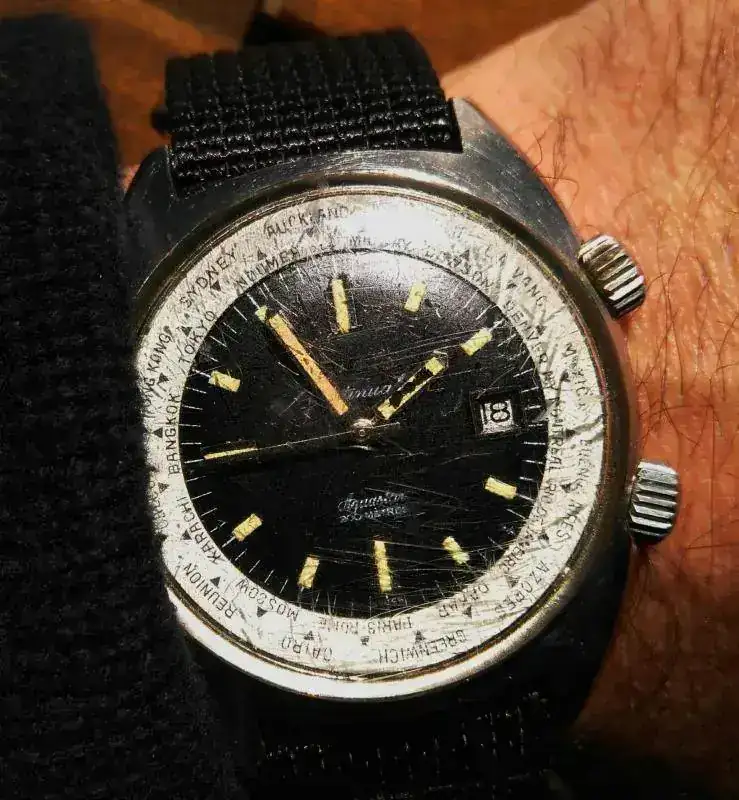 Un reloj que me recuerda a la infancia, jugando con las dos coronas, imaginando esos paises imposibles del bisel, pegar la oreja para escuchar ese hipnótico tic-tac, fascinado con su lumen en la oscuridad, y sobre todo, viendo a mi padre saliendo del agua con algún ejemplar de las profundidades marinas.