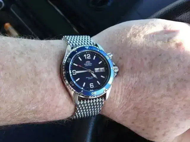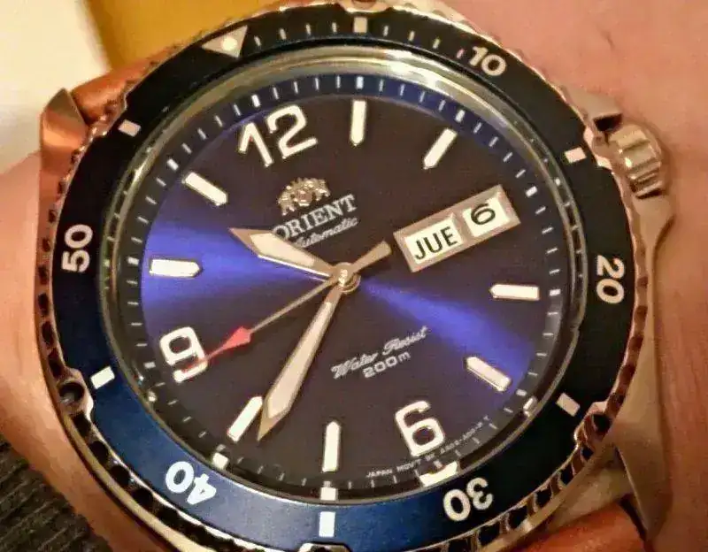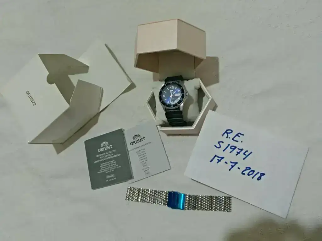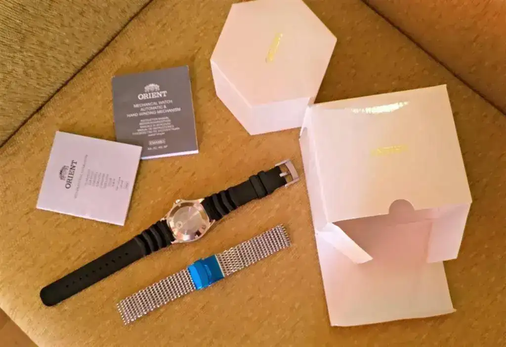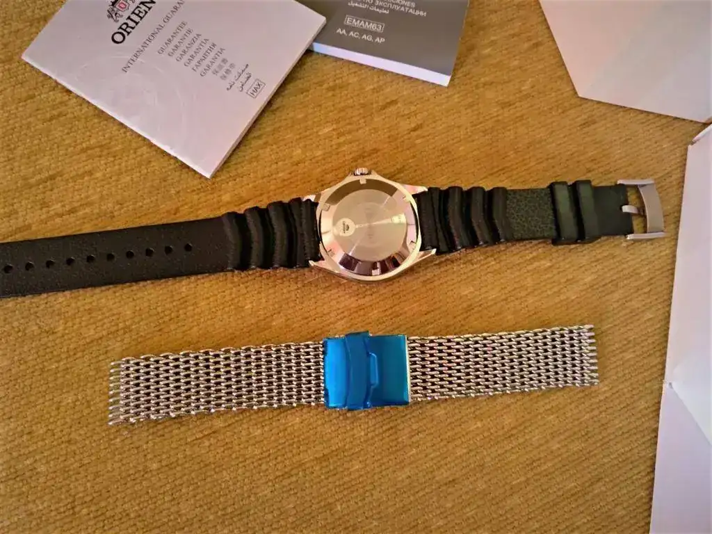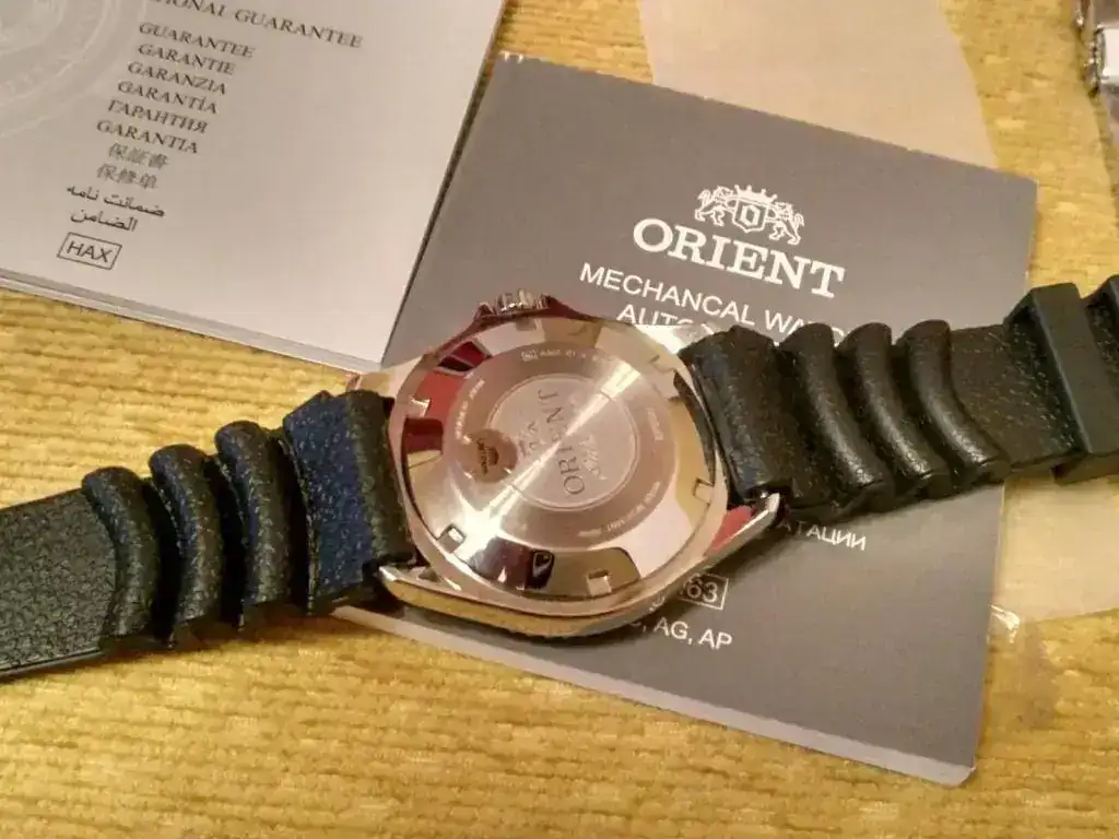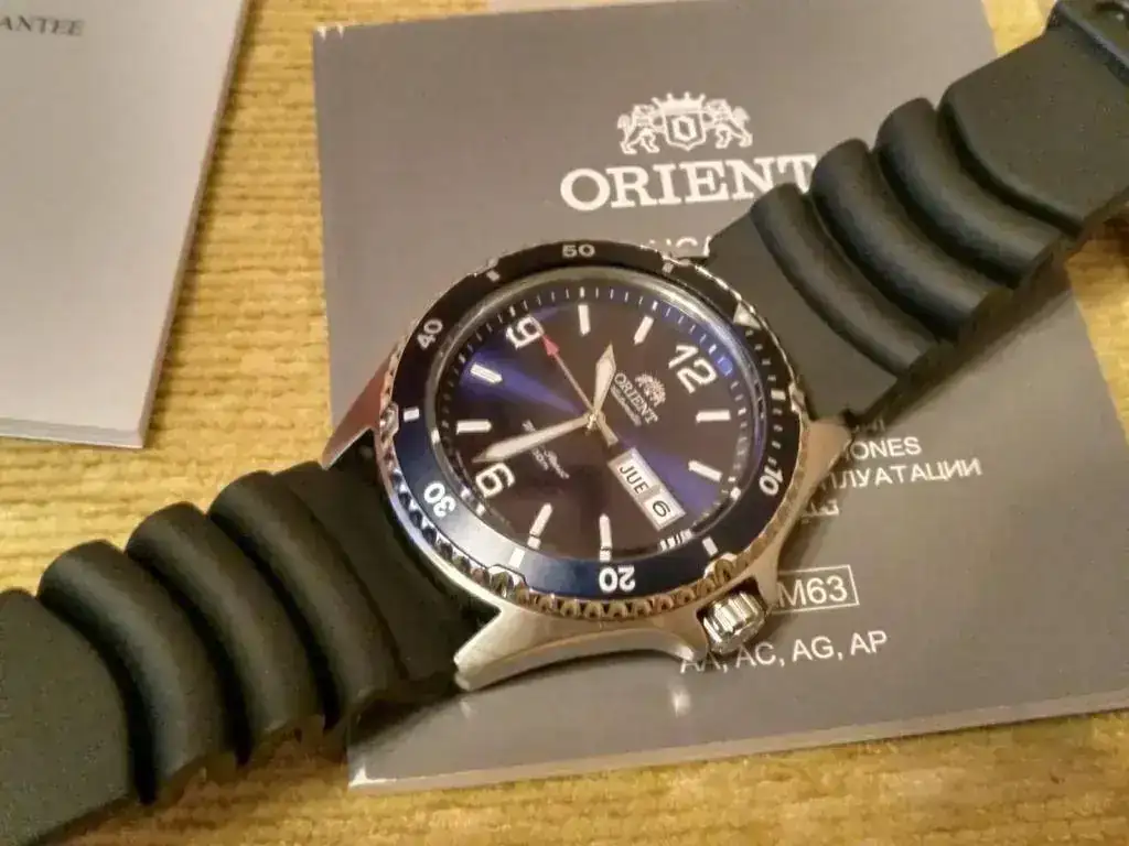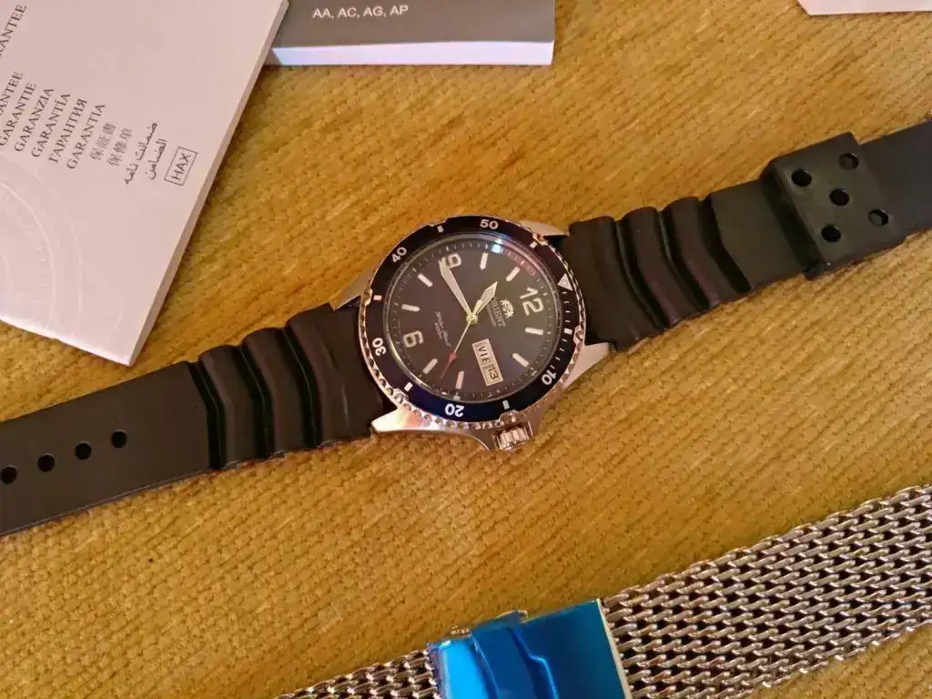 Hola a todos, pongo a la venta este Orient Mako 2 en un azul precioso con un lume y marcha estupendos, admite carga manual y parada de segundero, calendario en Ingles y Español, y lo poco que lo he usado (No mas de 5 puestas) su marcha es excelente, no adelanta mas de 4 o 5 seg. día, esta impecable, algún leve pelo en la caja que no vale la pena ni mencionar, incluye manual, garantía sellada, estuche (me llegó con este estuche tan cuqui) correa de caucho tipo z22 e incluyo correa Milanesa sin estrenar de las gorditas por 14 euros mas.