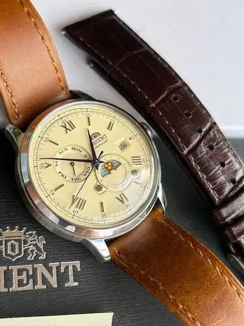 Vendo este Orient Bambino fases lunares. Se trata de un reloj automático de 41,5mm de diámetro y una altura de 14mm. Tiene el fondo visto, dial color crema, al agujas azules templadas, función de día de la semana y fases lunares Es escuentra en estado de reestreno, entregándose con sus caja papeles y las dos correas que se ven en las fotos. La correa original que se encuentra a estrenar y la que lleva en las fotos.