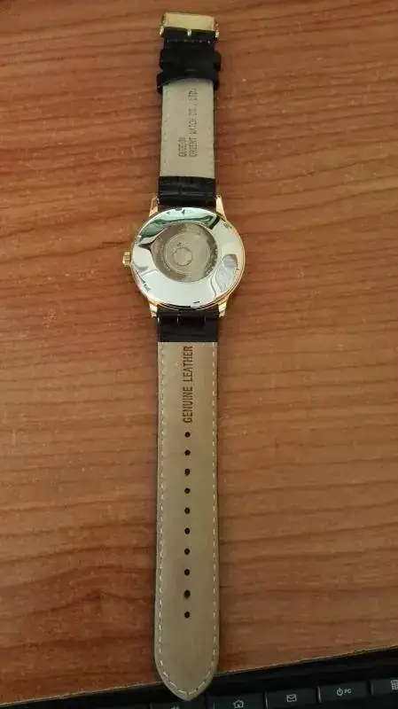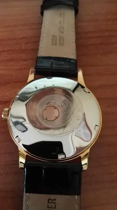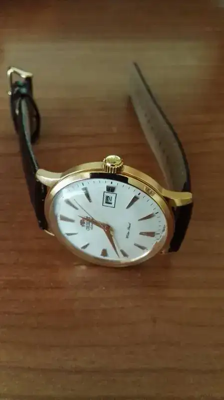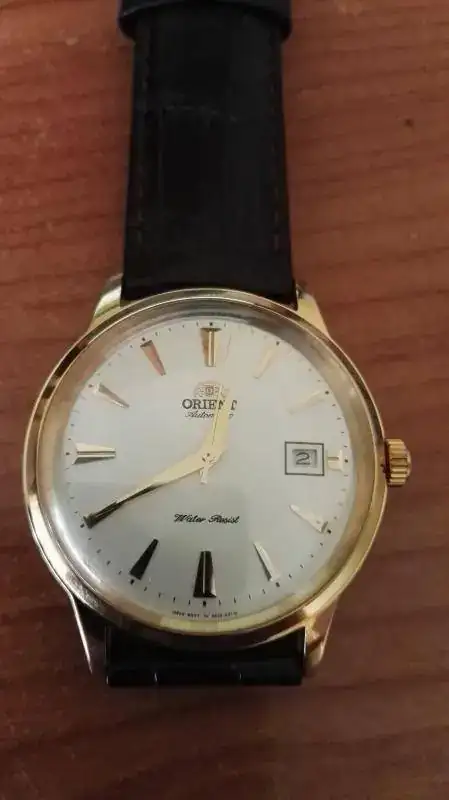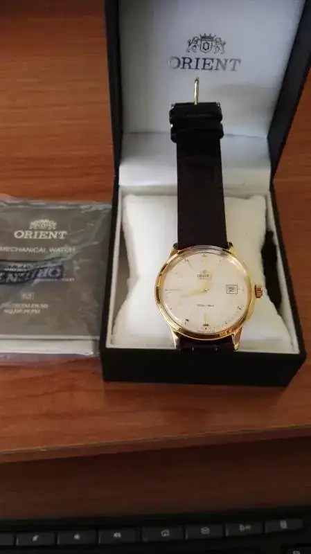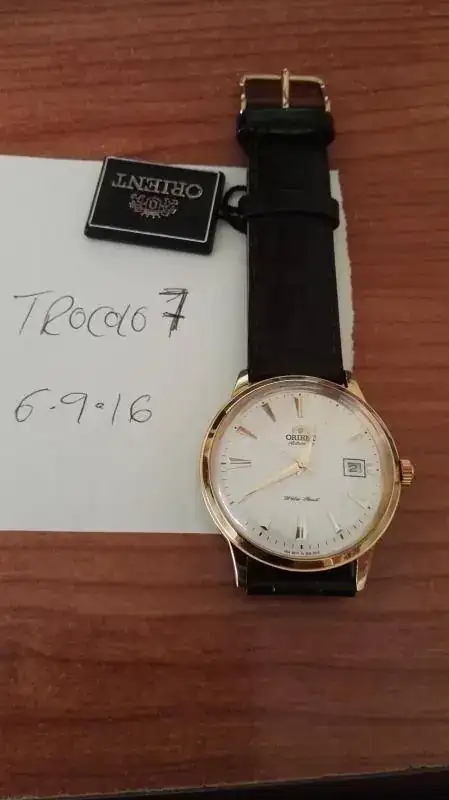 Buenas tardes a todos. Vendo Bambino dorado con una sola puesta. Se puede decir que está nuevo porque aparte de la única puesta, el reloj está inmaculado. Conserva el plástico de la tapa trasera. Y la susodicha puesta, con otra correa, así pues, la suya está sin estrenar. Pocas observaciones caben señalar sobre este icónico modelo de Orient, por lo tanto, decir que va completo, caja exterior, interior, etiquetas, garantía en blanco y factura de compra en la web teutona OrientUhren, el 31/05/16