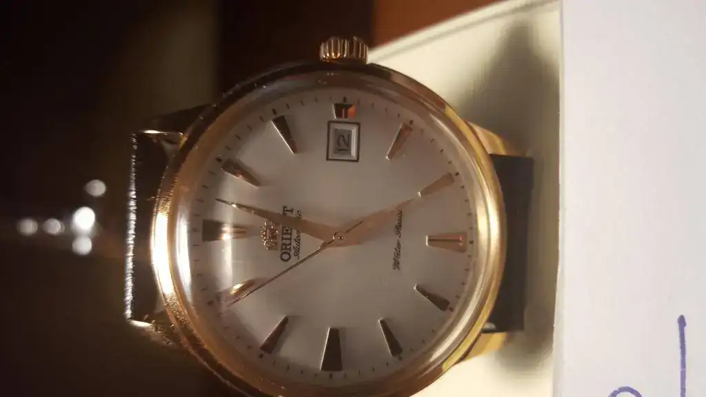 Vendo este elegante y muy bien conservado ORIENT BAMBINO de caja de 40 mm en pvd oro amarillo a juego con los indices que resaltan sobre su limpio dial blanco . Creo que es un reloj que no necesita presentacion . El estado es de reestreno la correa de piel ORIENT en color marron oscuro brillo resalta la belleza de este bonito reloj