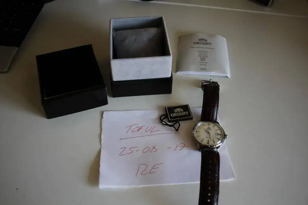 Vendo Orient Bambino, en su primera versión. Se trata de un reloj muy conocido en el foro y del que hay mucha información por lo que no me alargaré. Lo vendo porque he adquirido un seiko sarb065 que ya cumple la misión que tenía este en la caja. Lo tengo hace años pero ha tenido poco uso, ya que me lo ponía en ocasiones especiales (soy de diver). Caja y cristal en perfecto estado. La correa presenta las marcas de haber sido usado pero es utilizable.