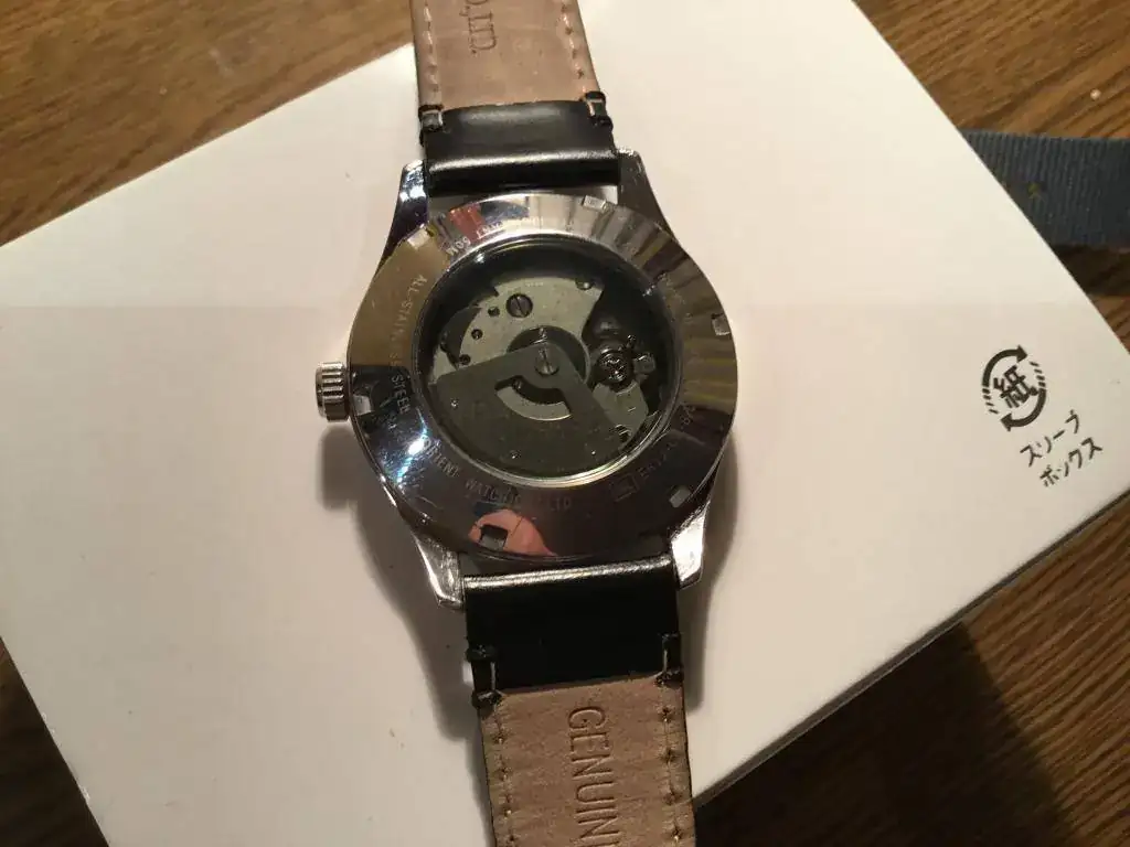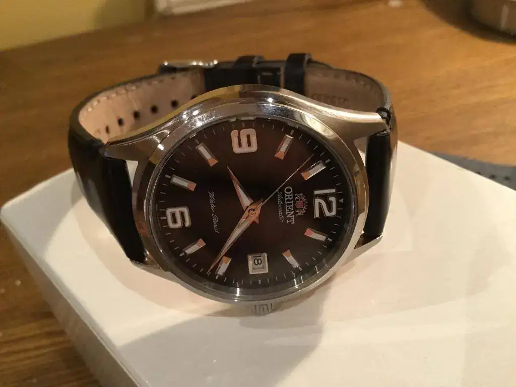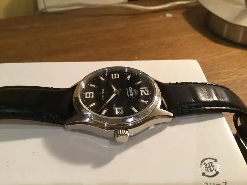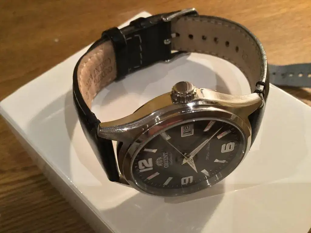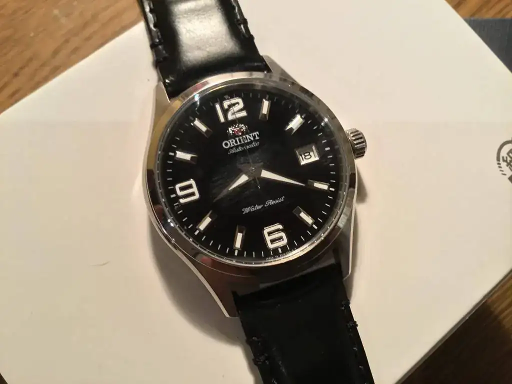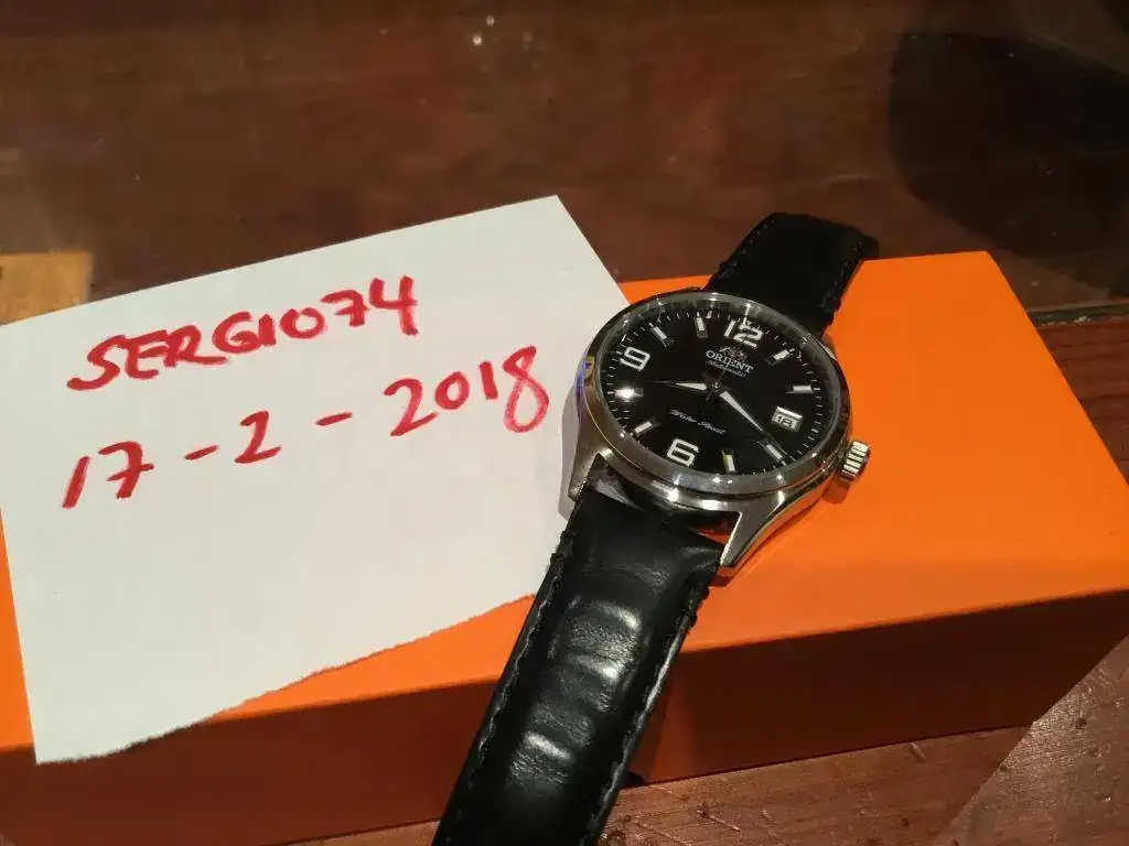 Vendo este Orient Chicane negro de 38 mm, automatico y en un estado perfecto. Trasera vista y correa de piel. Esfera negra y índices plateados.