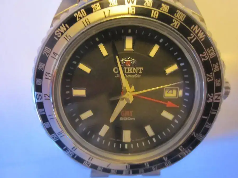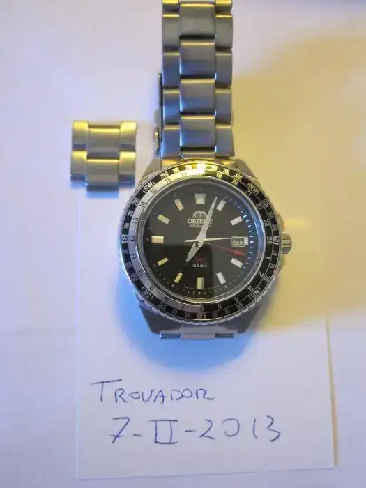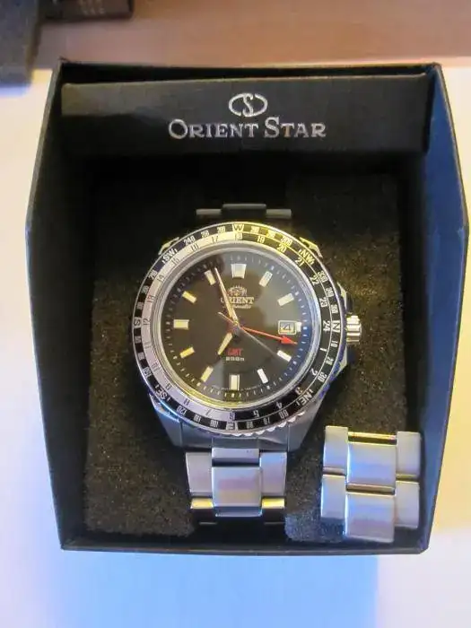 Se trata de un reloj contundente, con presencia en la muñeca, y que tiene la particularidad de poseer aguja GMT para el cálculo de otro huso horario. Tiene la calidad de acabado de todos los Orient y de marcha anda muy, muy bien. El estado es excelente. Solamente tiene los micro pelillos en el armix y en el cierre, que he intentado sacar en las fotos, aunque la fotografía no es lo mío. Lo entrego con su caja y los dos eslabones sobrantes de ajustarlo a mi muñeca.