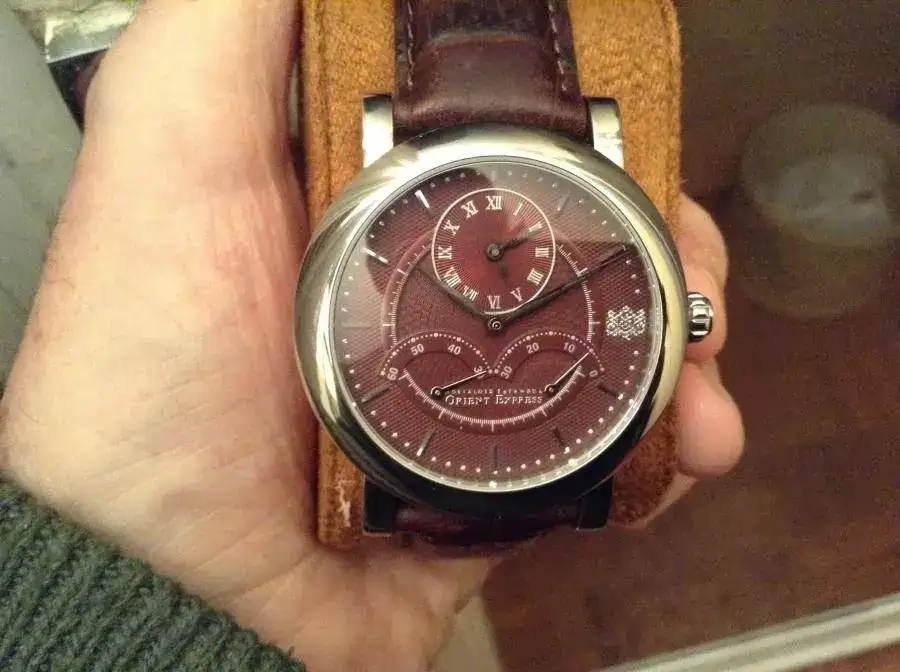 Pensareis que es un modelo de la manufactura Orient. Pues no. Es un reloj muy exclusivo fabricado y diseñado por auspicios de la prestigiosa compañía Orient Express que aparte de la línea férrea posee una cadena de hoteles de gran prestigio. Una chulada de colección.