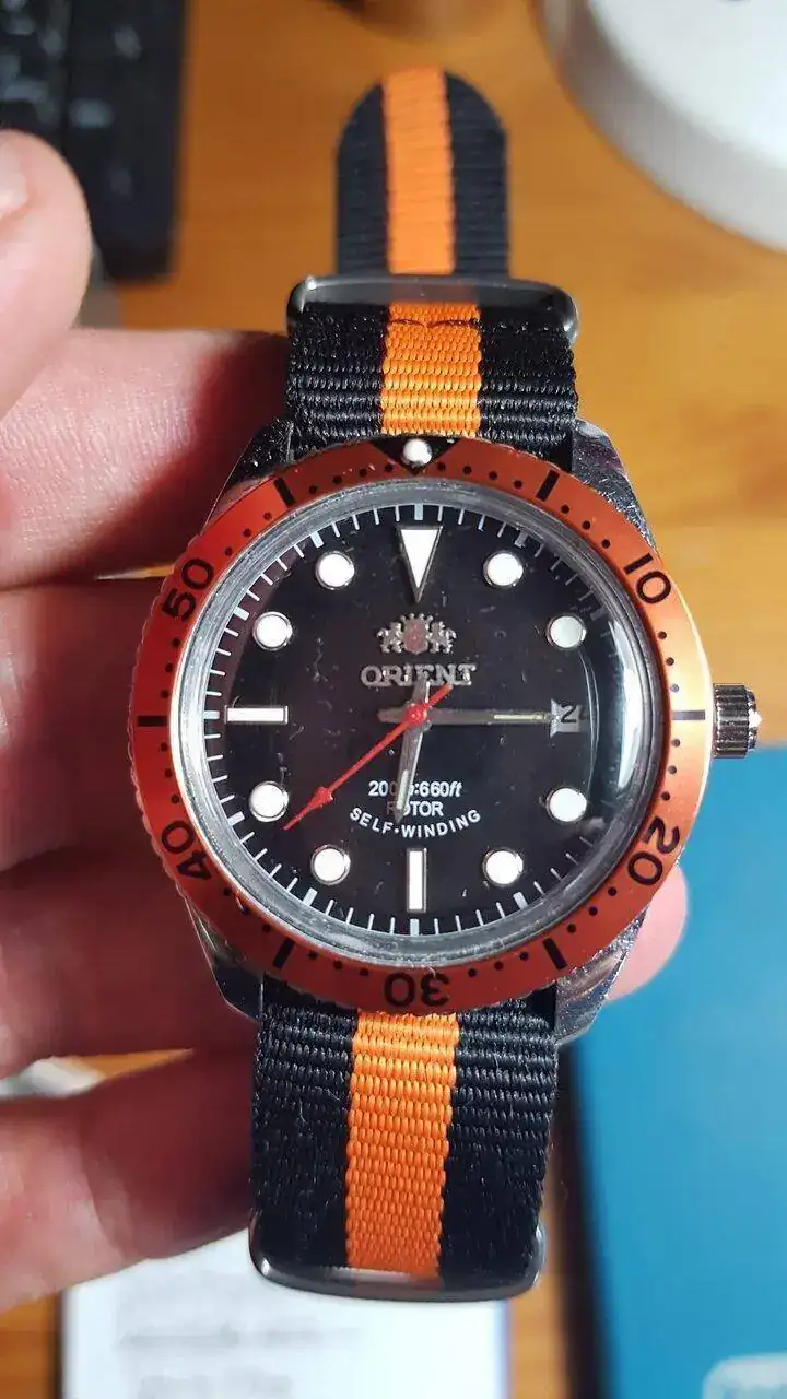El Navy tiene una esfera de 30mm por lo que tenía que buscar una esfera Orient de 30, las hay pero son muy escasas, la mayoría son de 28,5 mm y además la quería negra. Empecé a buscar en Aliexpress y encontré una con marcas luminiscentes y el triángulo característico a las 12, llevaba también la profundidad (una patraña) y el título rotor self-winding que se refiere al sistema de carga automática.