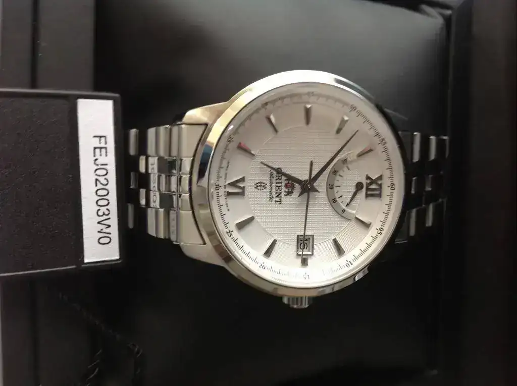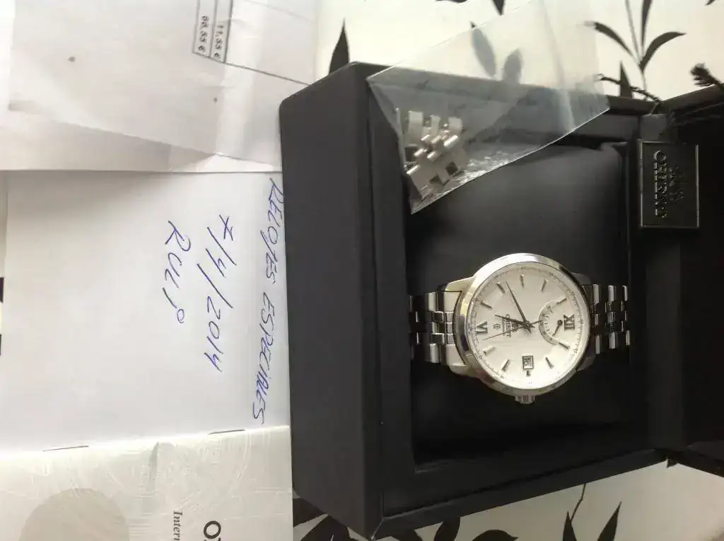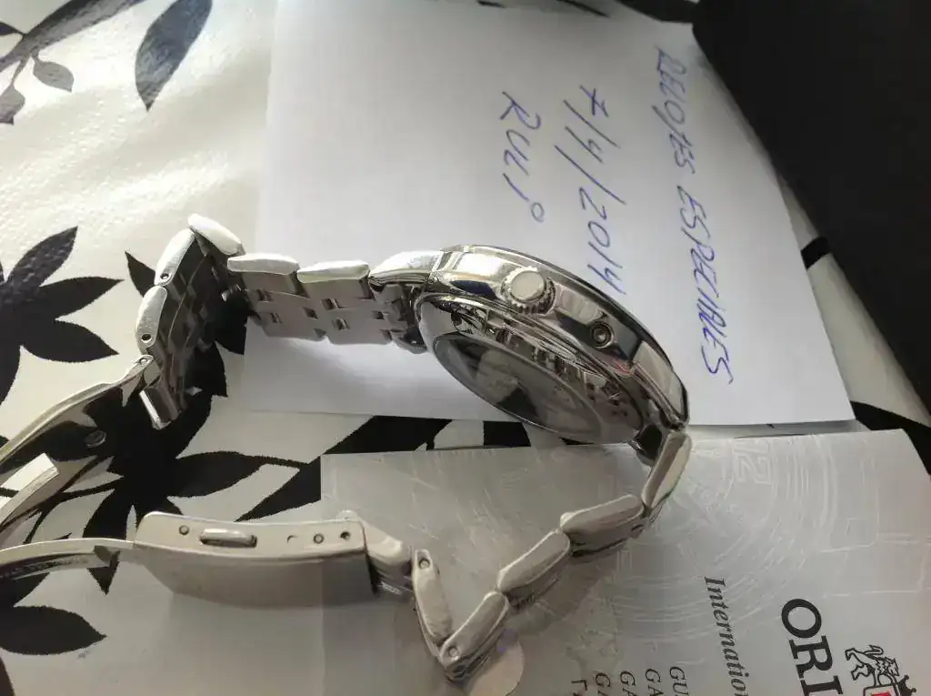 Vendo este Orient, con indicador de reserva de marcha, de 38 mm sin contar corona, cristal de zafiro, comprado nuevo en abril del 2013, revision completa en noviembre de 2013 en una muy buena relojeria porque no daba con el servicio tecnico oficial y el reloj estaba mas seco que la mojama, osea que esta en garantia por union relojeros en Madrid, aporto factura.