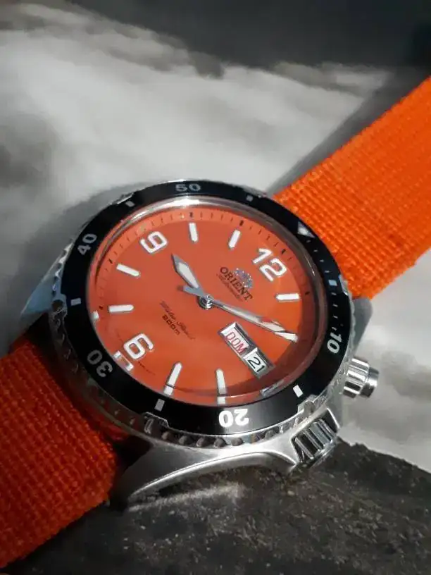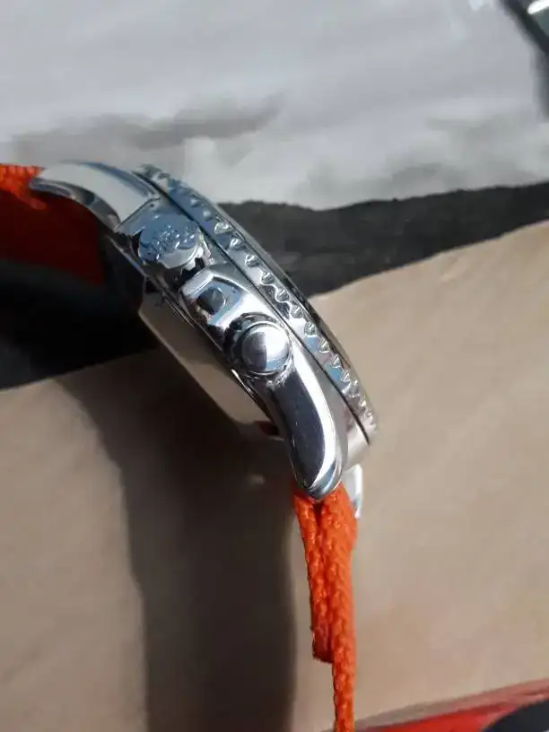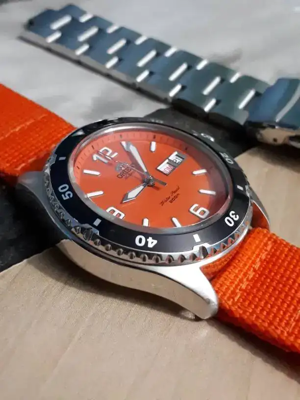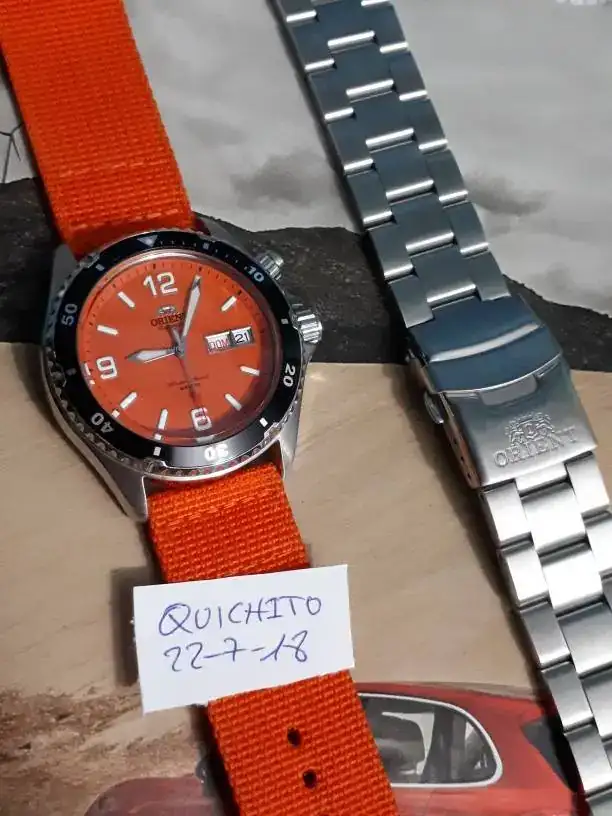 Se vende con la correa de textil naranja a juego con la esfera y su armis, que está en excelente estado como se puede ver (muy poco uso porque se sustituyó por la correa)
