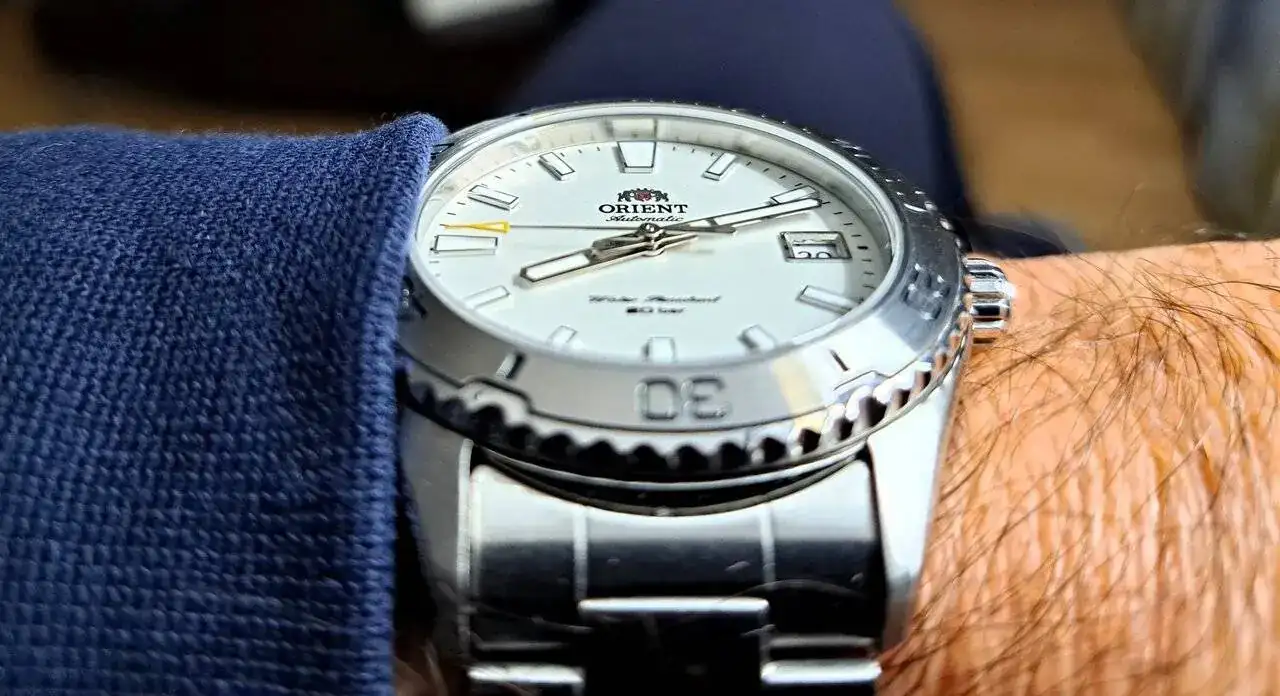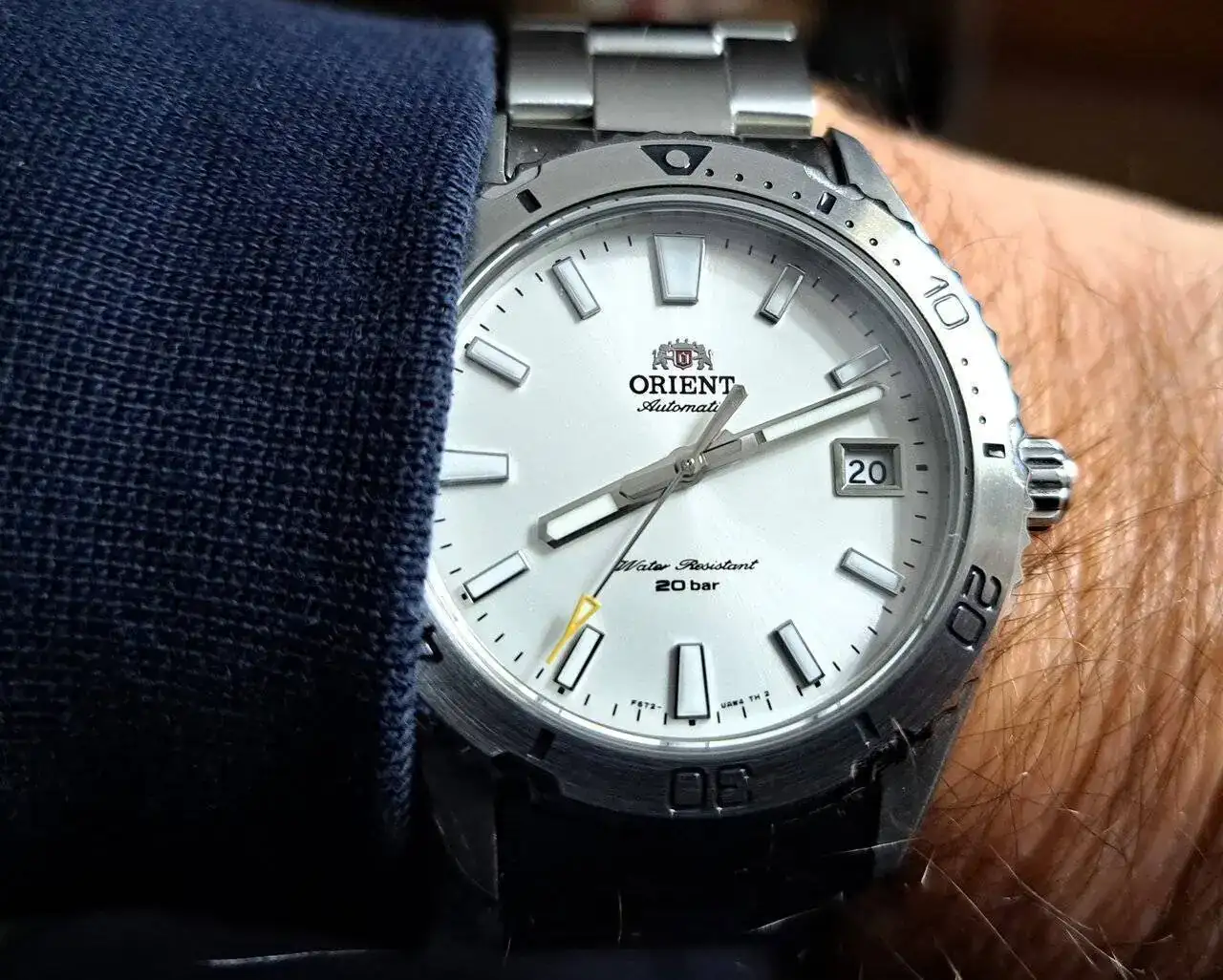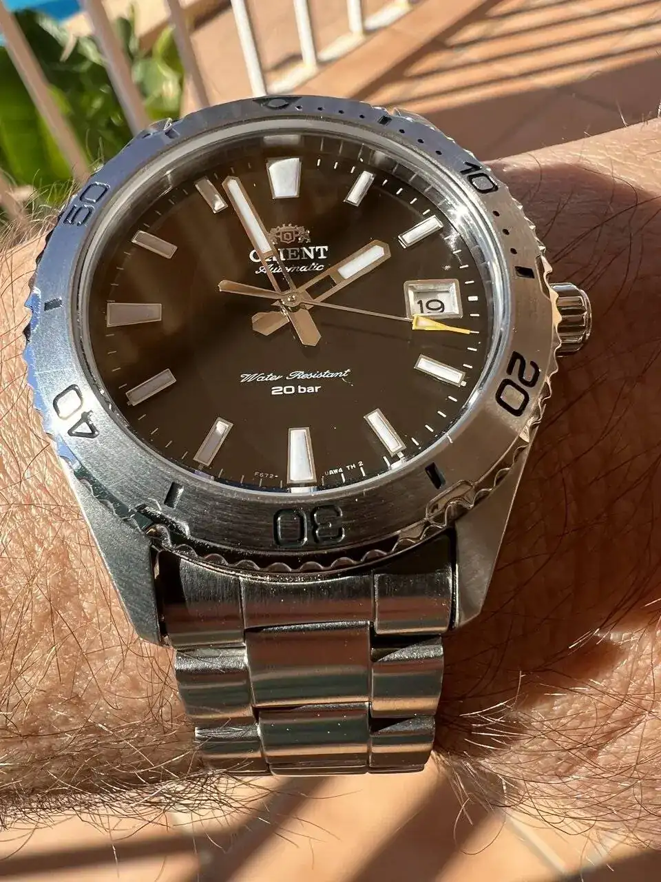Por lo demás, cristal de zafiro, corona roscada, 20bar de resistencia al agua y la calidad de construcción intachable habitual de orient.
